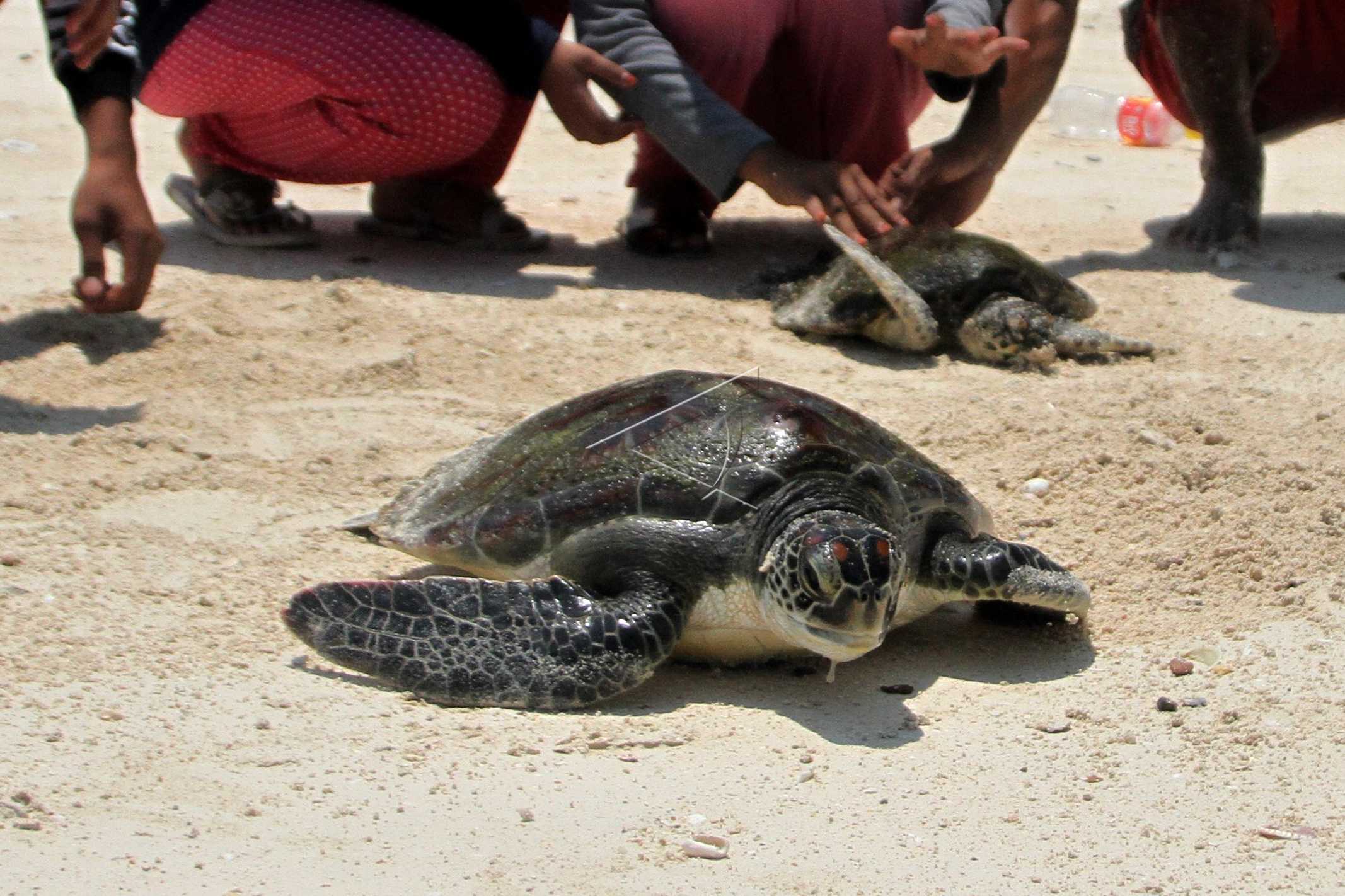 Pelepasliaran Penyu Sisik (Eretmochelys imbricata) di Pulau Bokori, Konawe Selatan, Sulawesi Tenggara, Minggu (28/10/2018). ANTARA FOTO/Jojon/dw/pras.