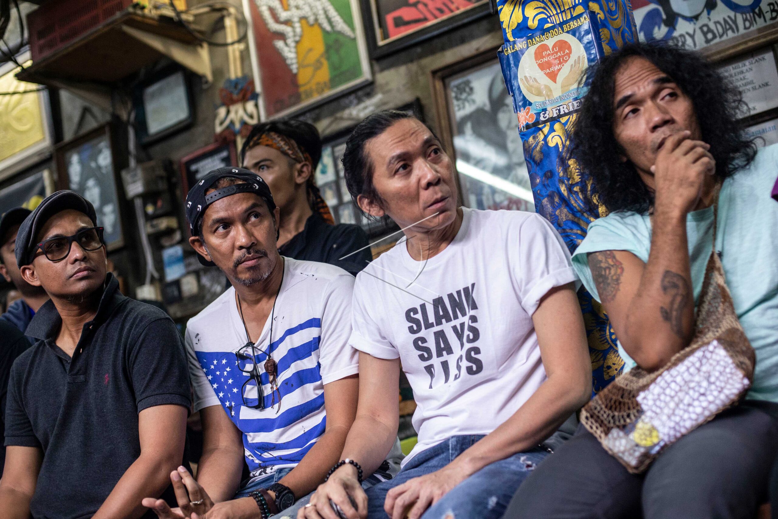 Personel grup band Slank Bimbim (kedua kanan), Ridho (kedua kiri), Kaka (kanan) dan Ivanka (kiri) saat menghadiri peluncuran video klip bertajuk #BARENGJOKOWI di markas Slank, Gang Potlot, Jakarta, Jumat (15/3/2019). ANTARA FOTO/Aprillio Akbar/wsj/dw.