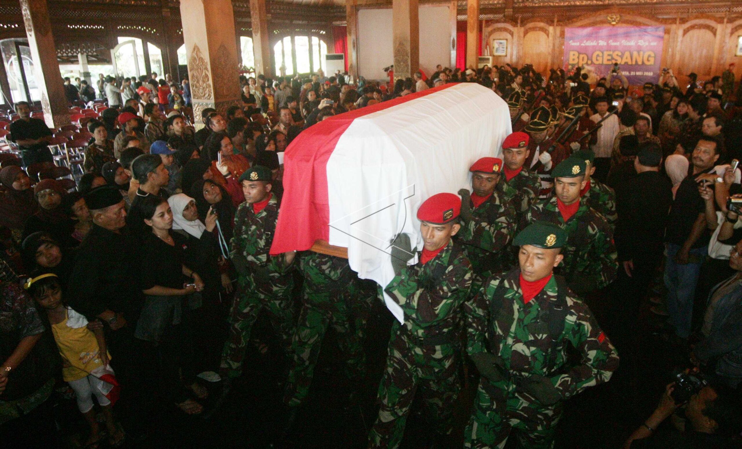 Sejumlah anggota Kopassus mengusung peti jenazah Gesang, dari Balaikota menuju TPU Pracimaloyo, Jumat (21/5/2010). Gesang dimakamkan dengan upacara militer atas jasanya kepada bangsa. ANTARA FOTO/Akbar Nugroho Gumay/Koz/nz/asf/10.