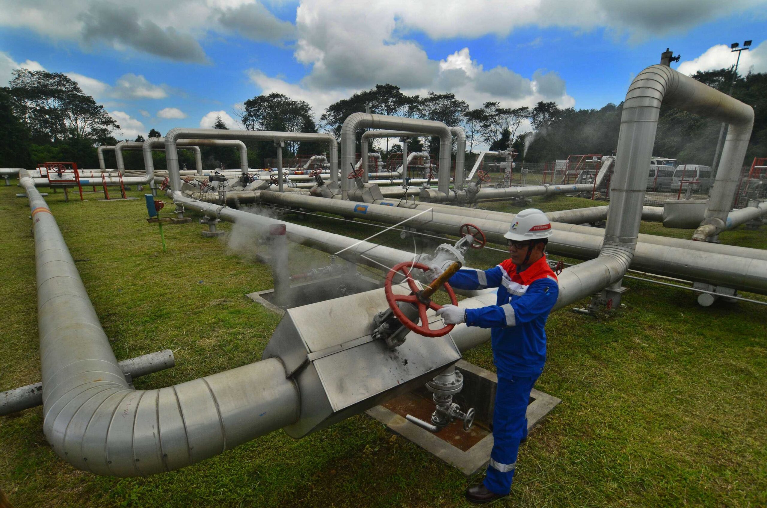 Petugas mengecek sumur bor produksi KMJ 71 Pembangkit Listrik Tenaga Panas Bumi (PLTP) Unit I Kamojang, Kabupaten Bandung, Jawa Barat, Selasa (28/2/2017). ANTARA FOTO/Adeng Bustomi/dw/pras.