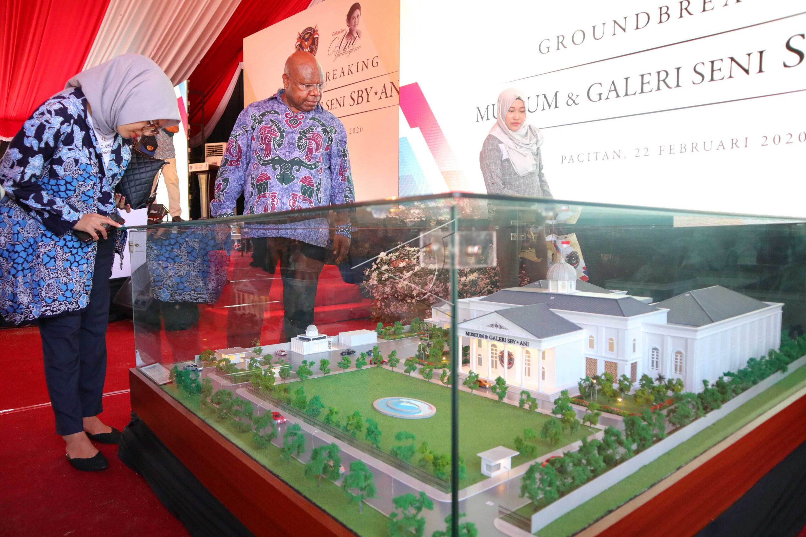 Pengunjung mengamati maket Museum dan Galeri Seni SBY-ANI di Pacitan, Jawa Timur, Sabtu (22/2/2020). Museum dan Galeri Seni SBY-ANI itu akan dibangun di atas lahan seluas 7.500 meter persegi dengan dua konstruksi bangunan utama yakni bangunan pertama merupakan Museum Kepresidenan SBY, sedangkan bangunan kedua adalah Galeri Seni Ani Yudhoyono. ANTARA FOTO/Riska/Destyan Sujarwoko/aww.