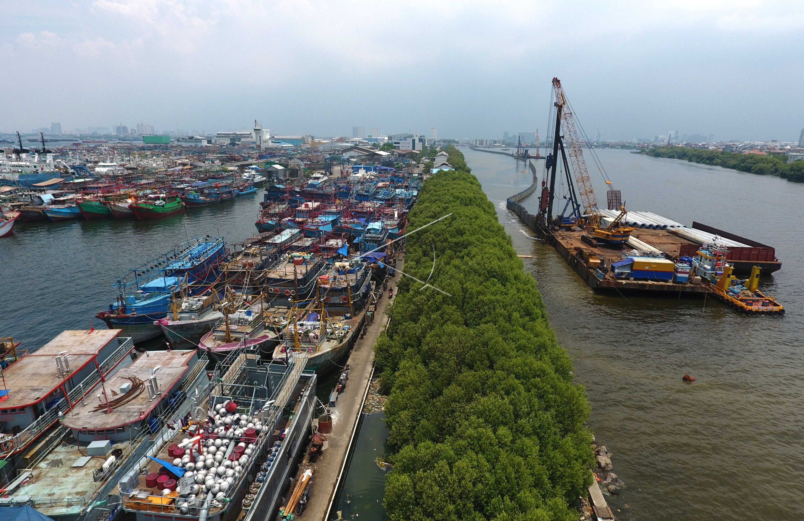 Pekerja menggunakan alat berat menyelesaikan pembangunan tanggul laut di Kawasan Pelabuhan Muara Baru, Jakarta, Senin (9/10/2017). ANTARA FOTO/Wahyu Putro A/dw/pras.