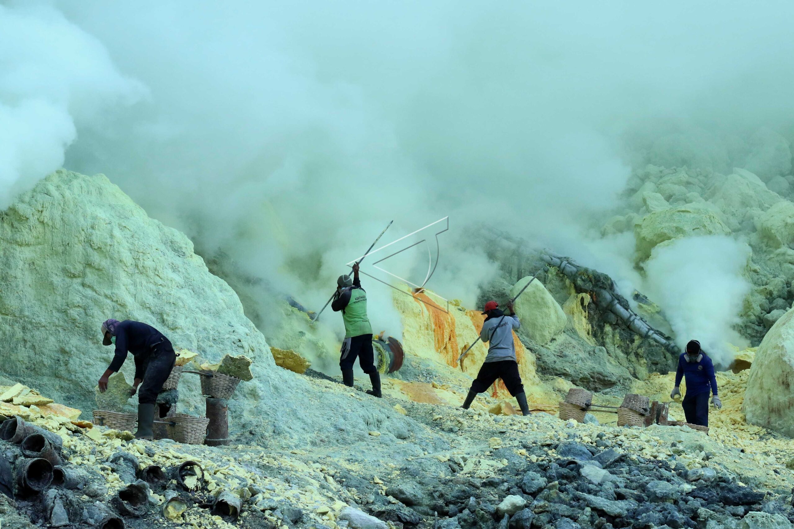 Pekerja mengumpulkan belerang untuk dijual ke pengepul, di kawah Gunung Ijen, Banyuwangi, Jawa Timur, Kamis (7/11/2019). ANTARA FOTO/Budi Candra Setya/aww/dw/nym.