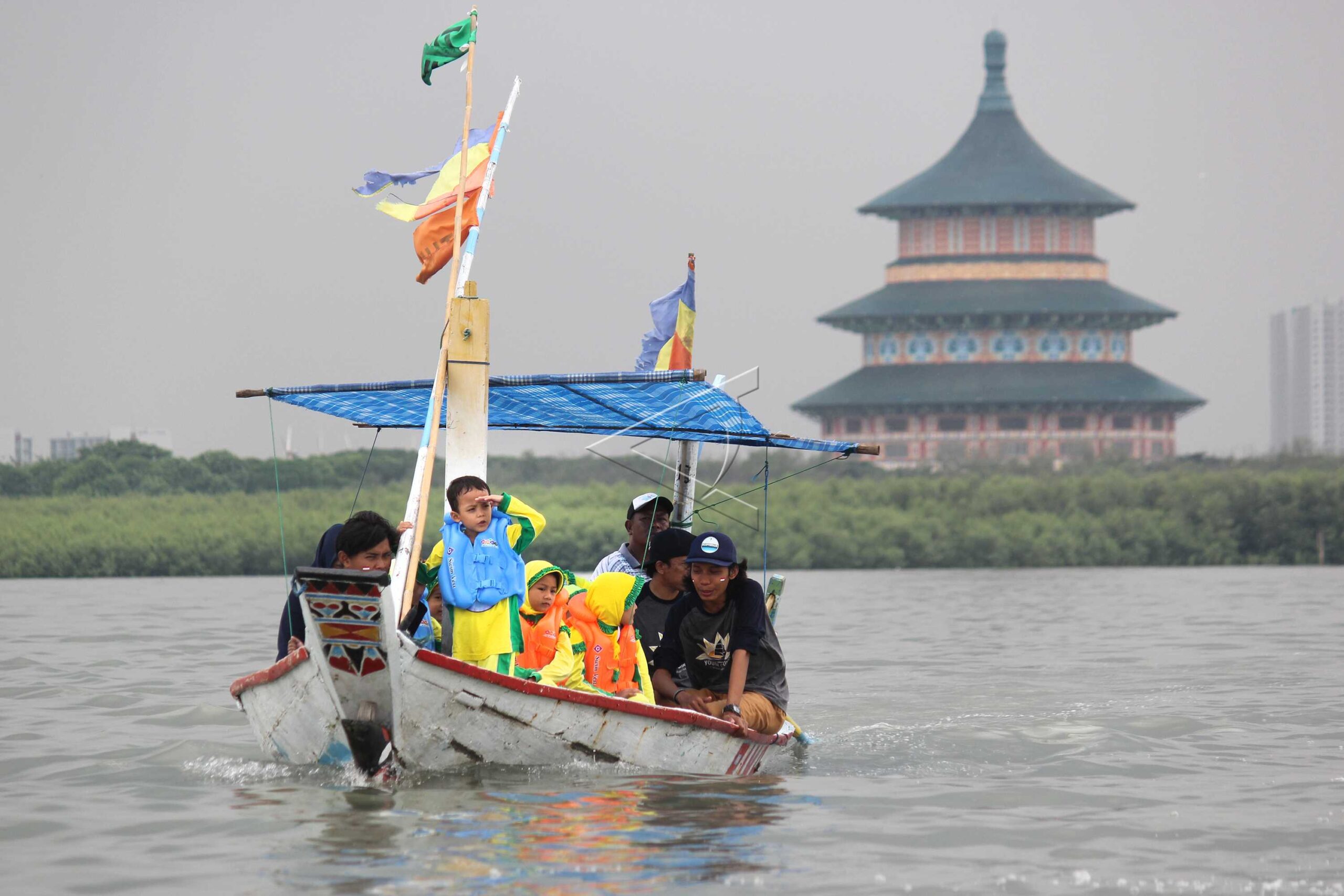 Sejumlah anak dari TK Aisyiah 66 Surabaya berkeliling dengan perahu saat mengikuti kegiatan pengenalan kematitiman di kawasan Pantai Kenjeran Surabaya, Jawa Timur, Rabu (1/2/2017). ANTARA FOTO/Moch Asim/foc/dw/nym.