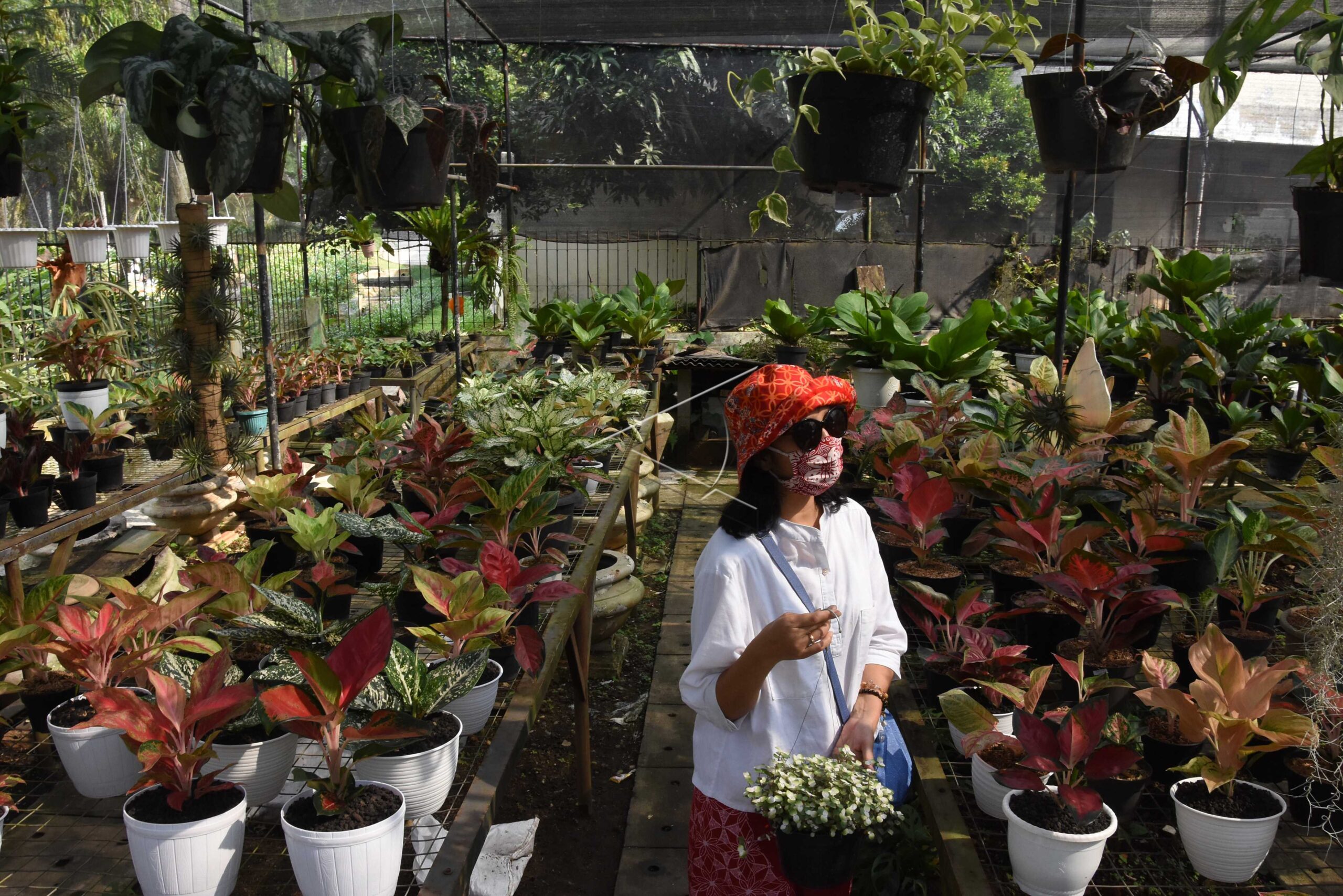 Calon pembeli melihat ragam tanaman hias di sentra penjualan tanaman di kawasan Ragunan, Jakarta, Minggu (19/7/2020). Menurut pedagang, penjualan tanaman hias meningkat hingga 300 persen sejak awal tahun di masa pandemi COVID-19. ANTARA FOTO/Indrianto Eko Suwarso/aww.