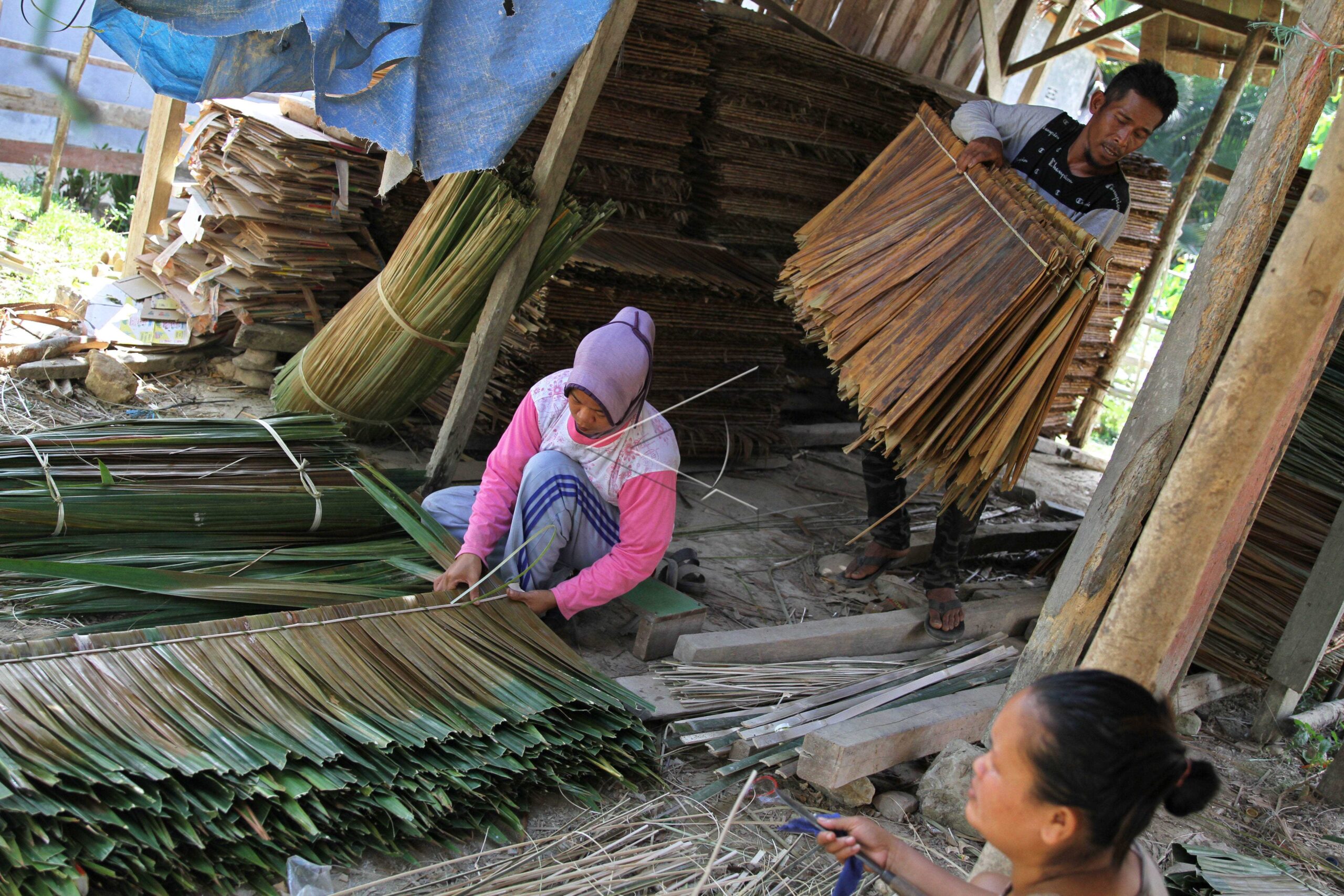 Perajin membuat atap dari daun sagu di Desa Lamomea, Konawe Selatan, Sulawesi Tenggara, Rabu (30/10/2019). ANTARA FOTO/Jojon/dw/tom.