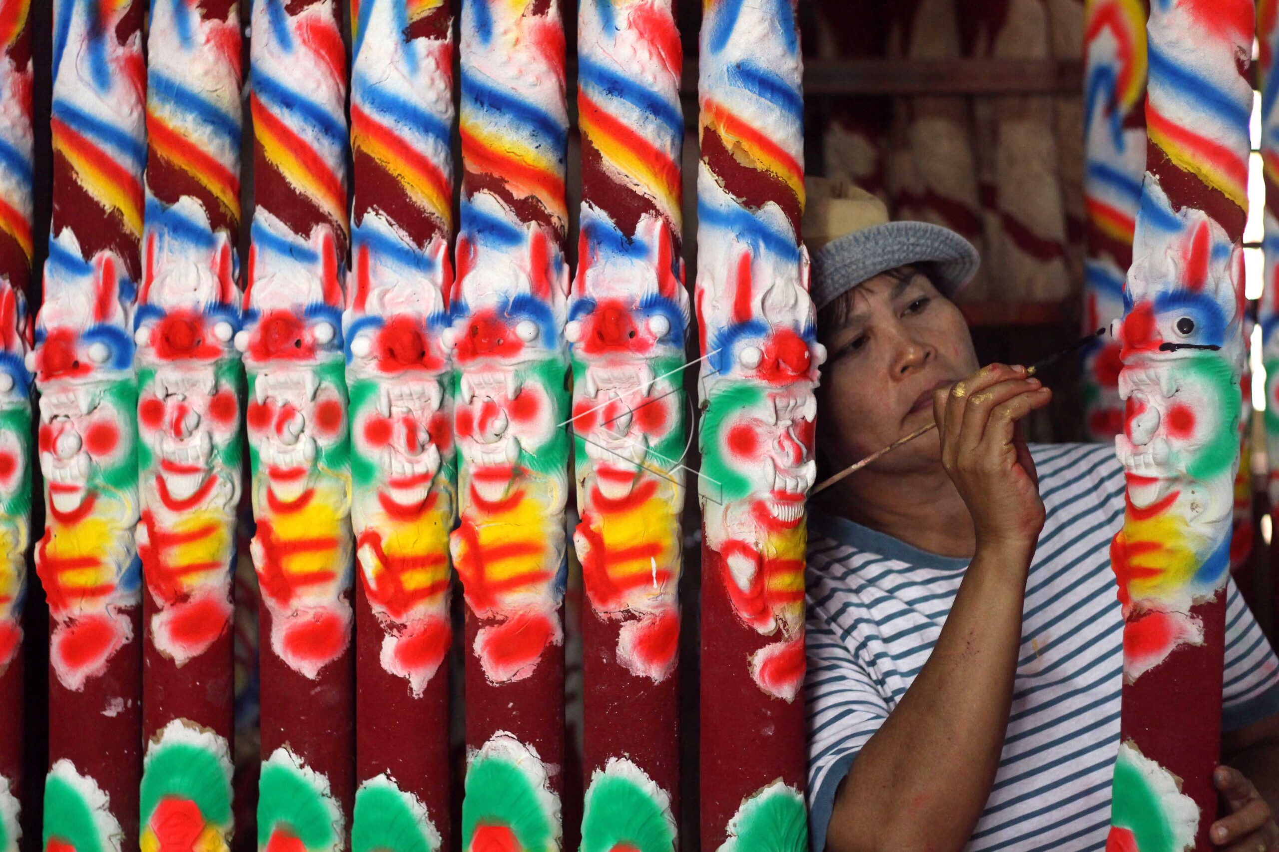 Perajin mengecat batang hio yang dibuat dari bahan serbuk kayu, di Medan, Sumatera Utara, Senin (25/1/2016). ANTARA FOTO/Septianda Perdana/dw/tom.
