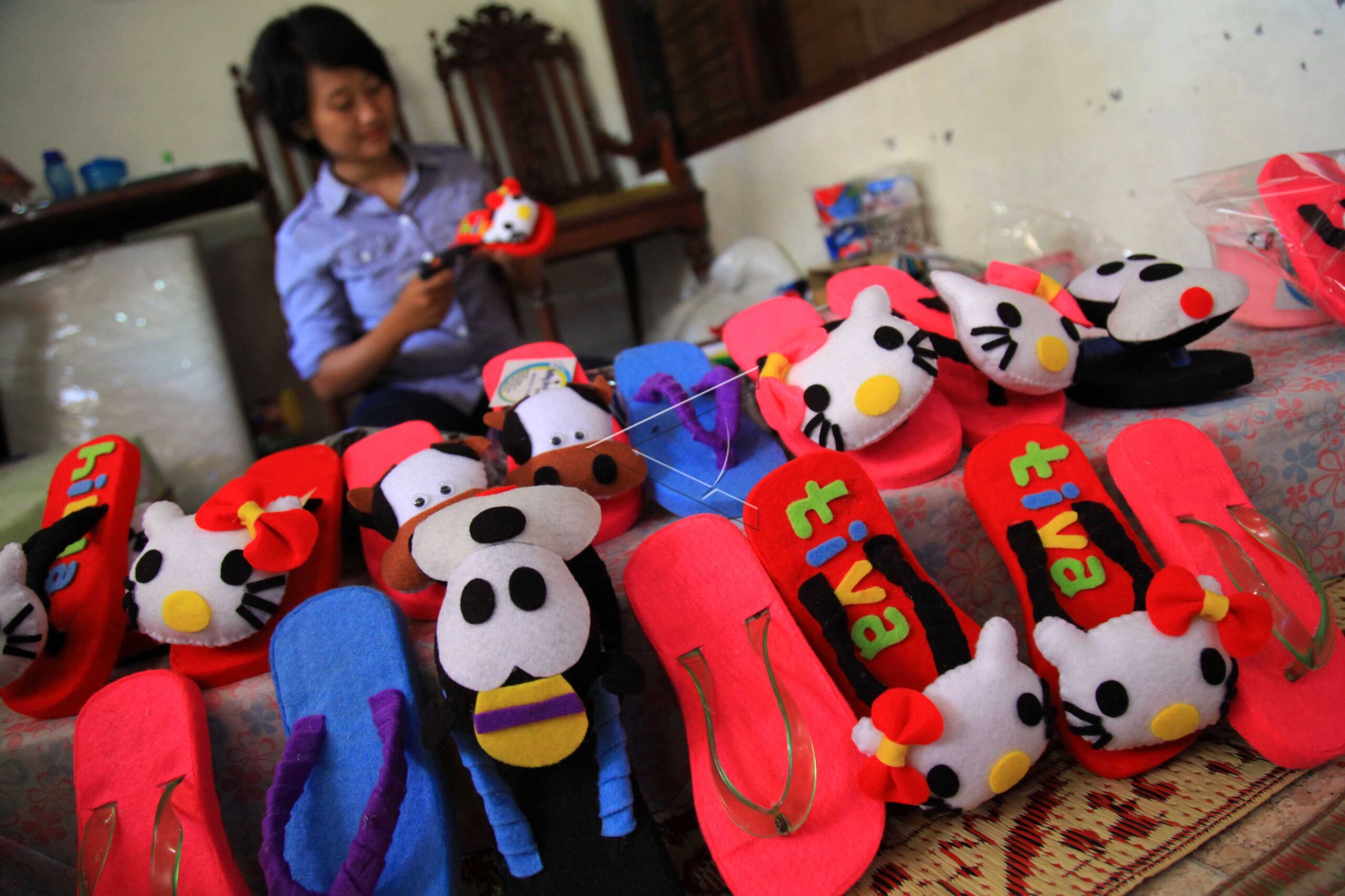 Perajin Ermawati (23) menyelesaikan pembuatan sandal berbahan kain flanel di Solo, Jawa Tengah, Kamis (18/2/2016). ANTARA FOTO/Maulana Surya/dw/tom.