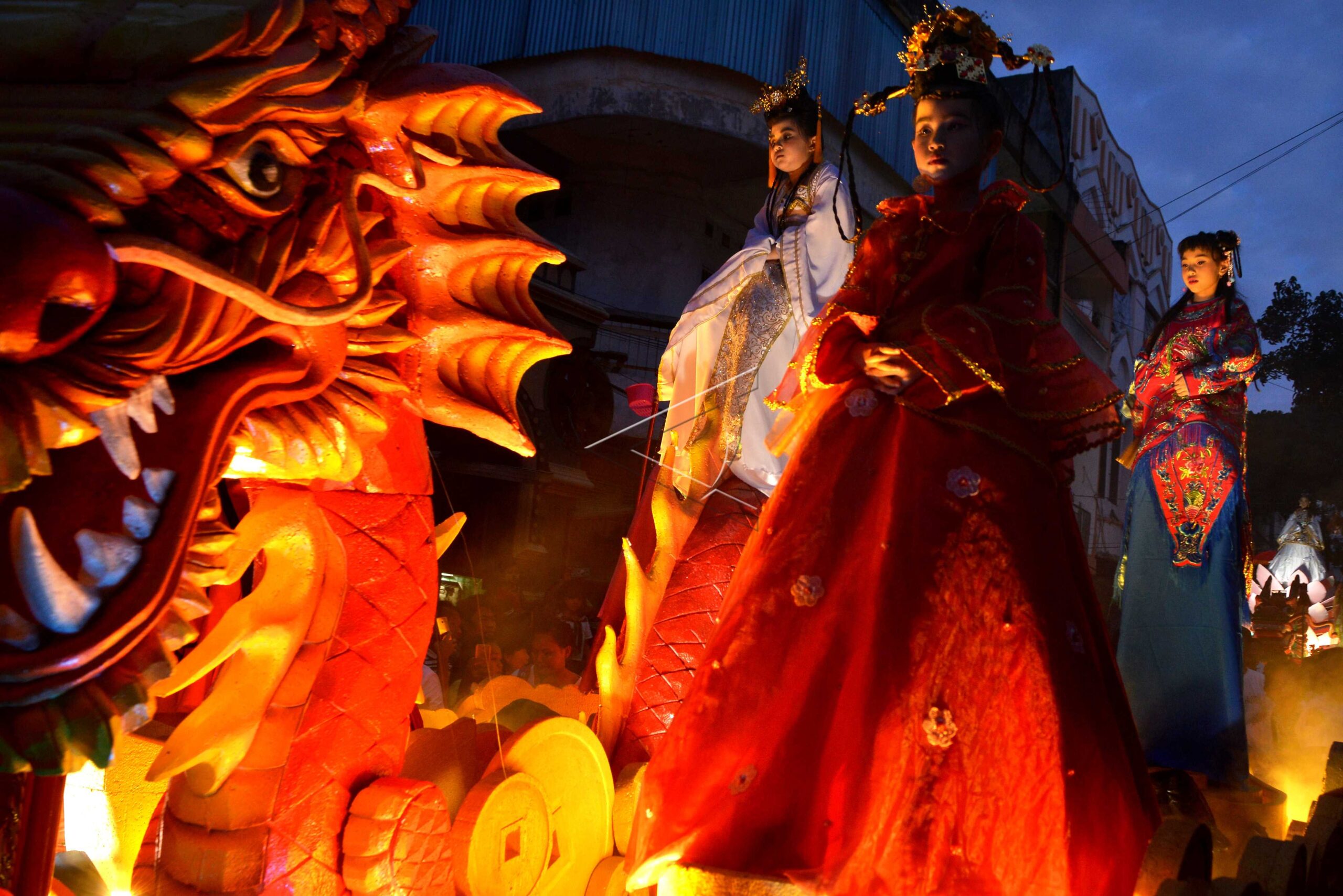 Anak-anak mengikuti pawai kendaraan hias pada puncak perayaan Cap Go Meh 2570 di Manado, Sulawesi Utara, Selasa (19/2/2019). .