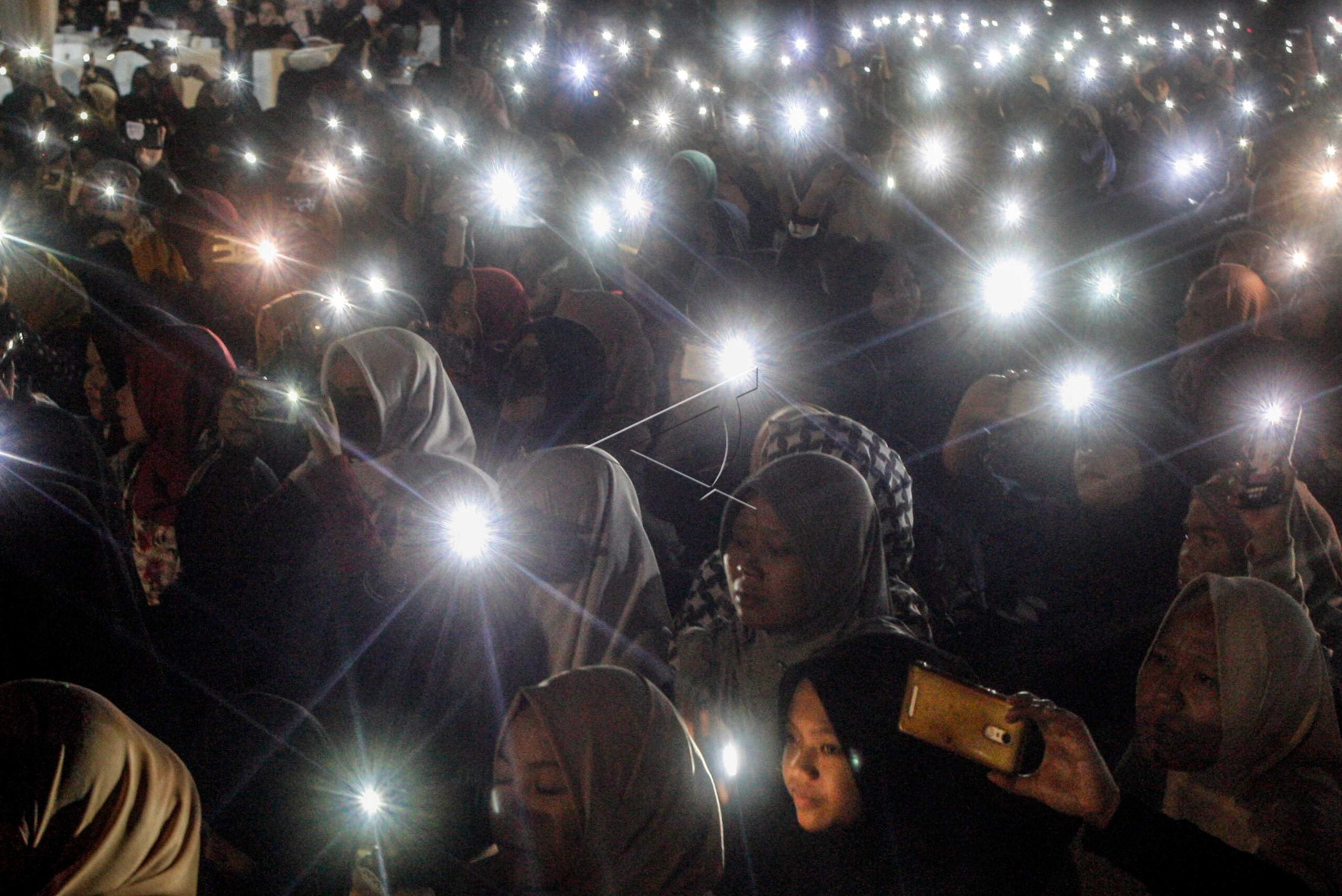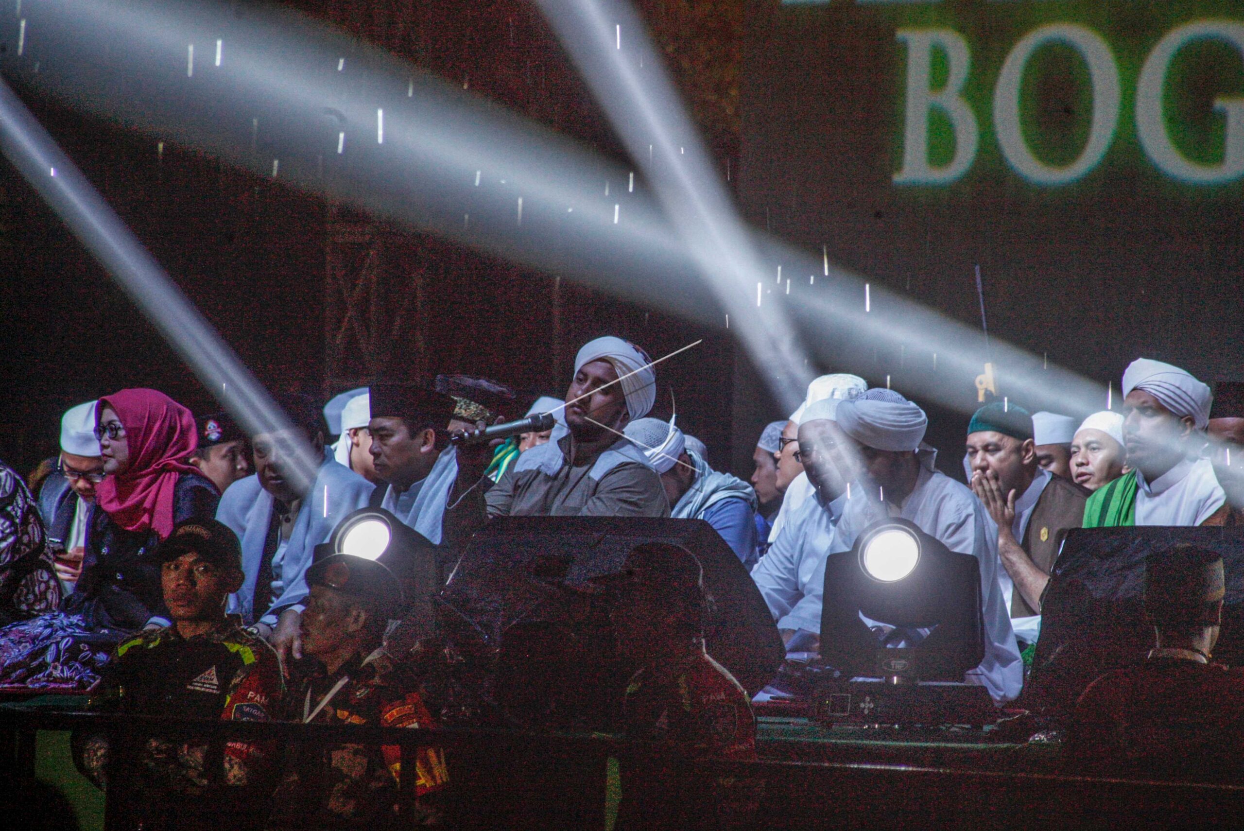 Habib Mahdi Assegaf (tengah) memimpin doa di sela pergantian Tahun Baru 2020 di Lapangan Tegar Beriman, Cibinong, Kabupaten Bogor, Jawa Barat, Rabu (1/1/2020). Pemerintah Daerah Kabupaten Bogor menghimbau tidak menyalakan petasan dan membunyikan terompet pada pergantian tahun, sehingga dirayakan dengan Tablig akbar dan doa bersama warga di Bogor. ANTARA FOTO. ANTARA FOTO/Yulius Satria Wijaya/pd.