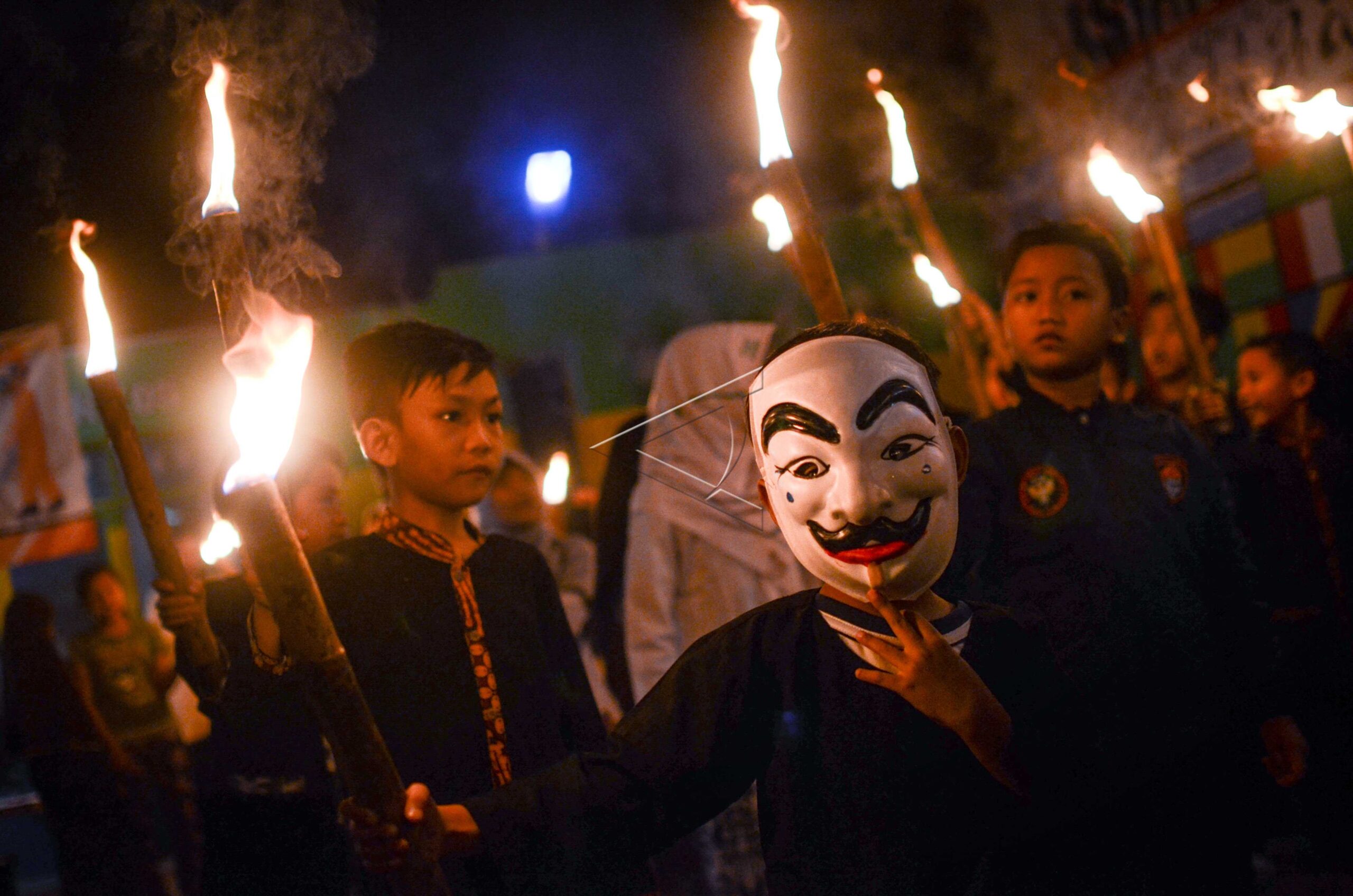 Sejumlah anak mengikuti pawai obor dalam rangka memperingati hari lahir ke-131 almarhumah Inggit Garnasih di Lio Genteng, Bandung, Jawa Barat, Sabtu (16/2/2019). ANTARA FOTO/Raisan Al Farisi/ama/dw/nym.