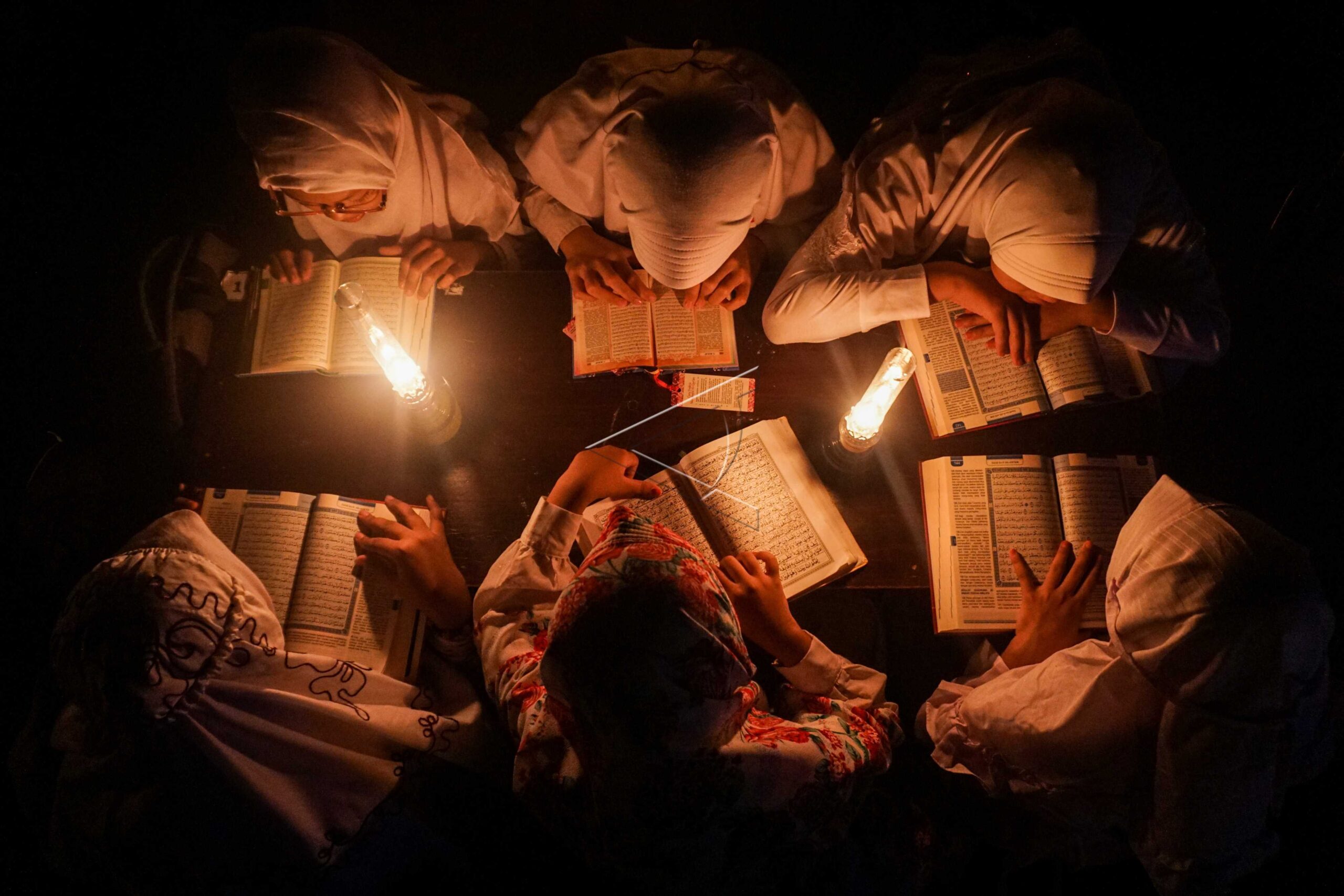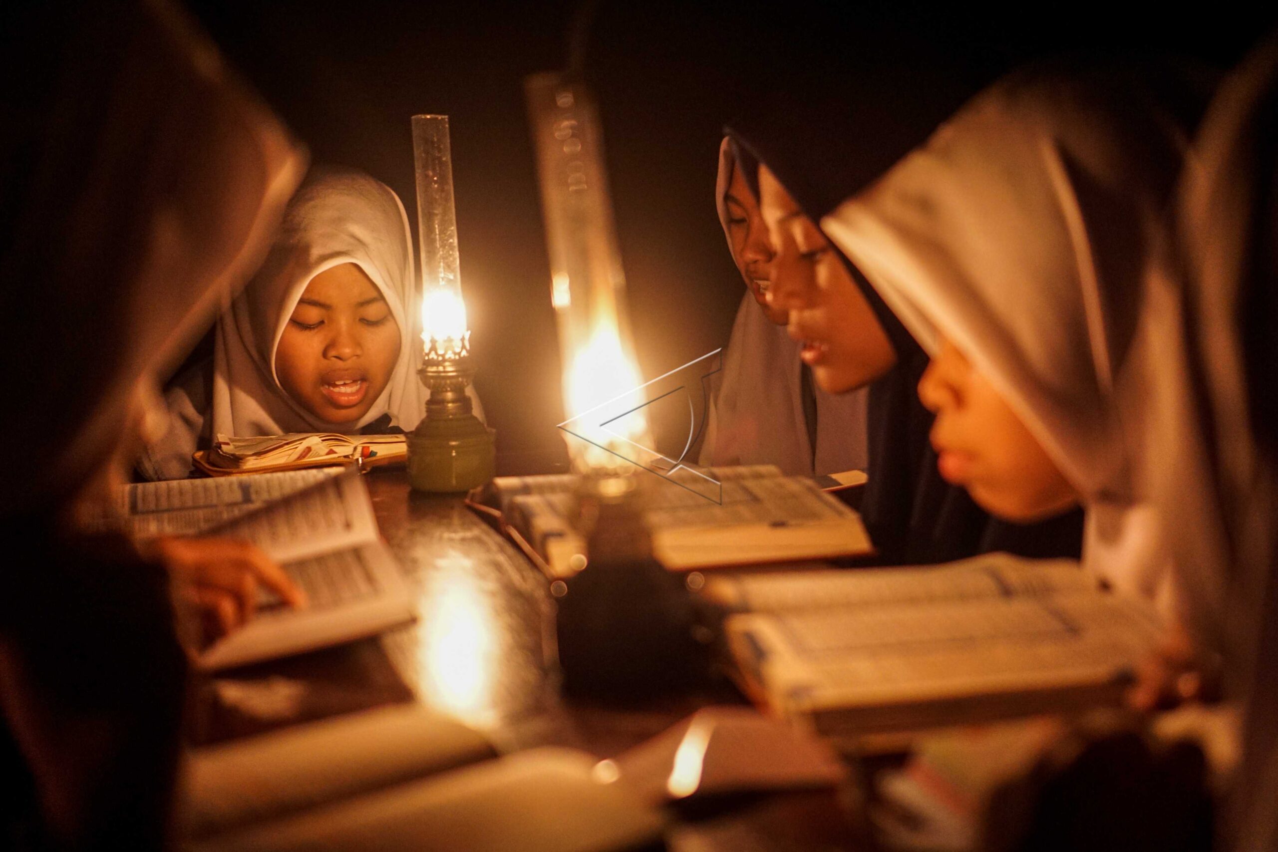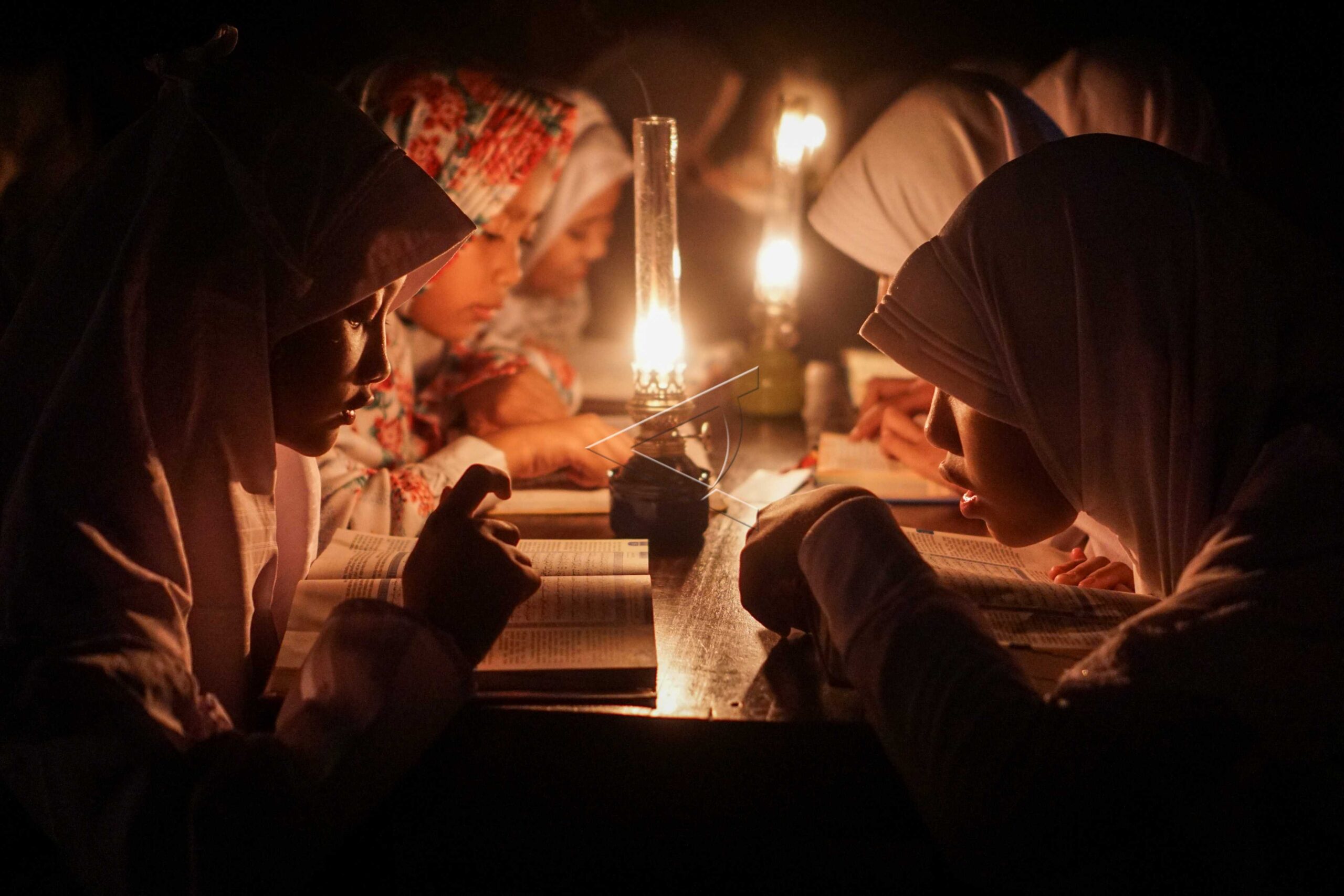 Santri pondok pesantren Baitul Mustofa mengaji dengan penerangan lampu minyak saat pengajian Tadarus Al Quran bulan Ramadhan di lapangan terbuka Mojosongo, Solo, Jawa Tengah, Senin (27/5/2019). ANTARA FOTO/Mohammad Ayudha/pd/dw/nym.