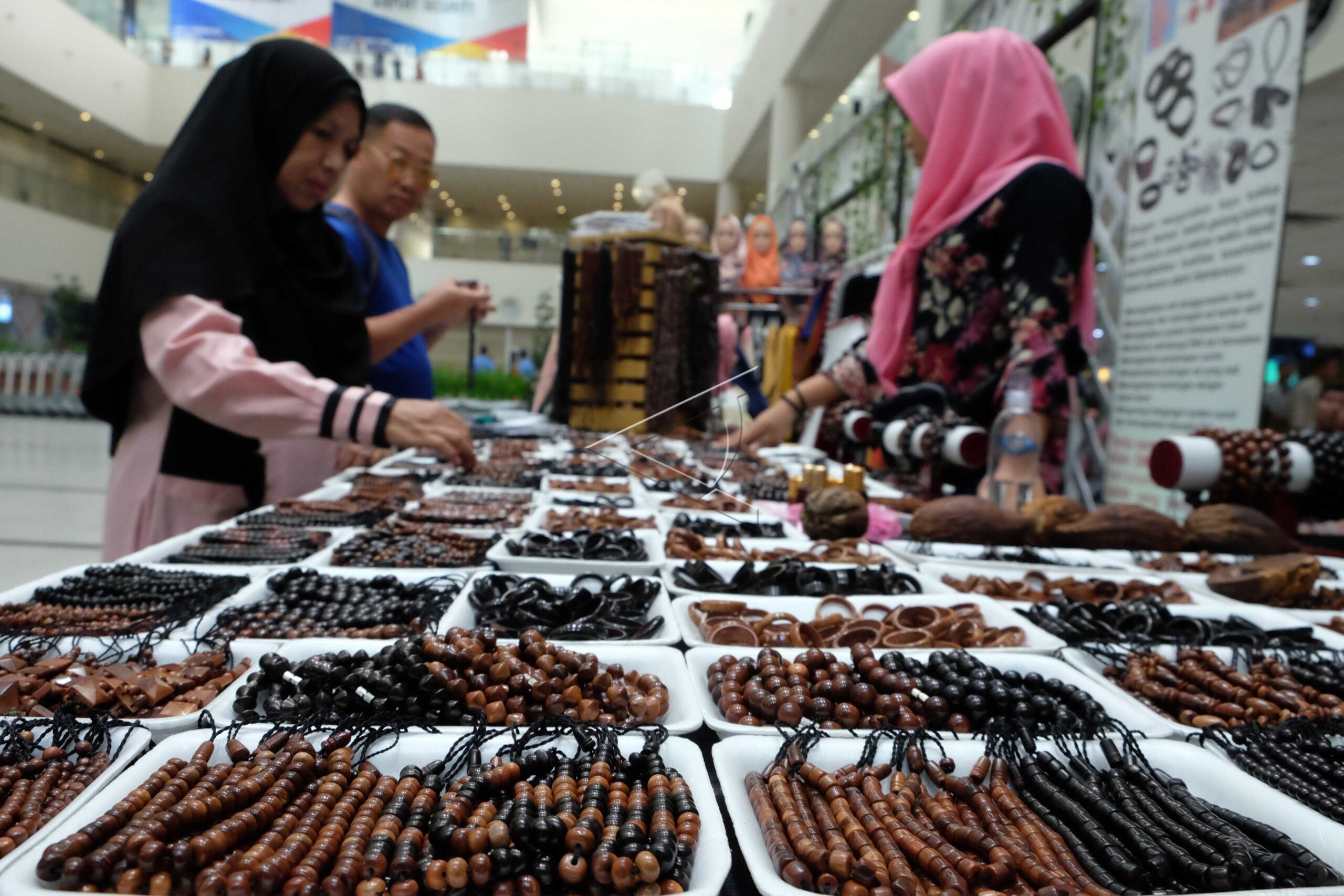 Calon pembeli memilih pernak-pernik dari bahan buah pohon kokka di area Terminal Kedatangan Bandara Internasional Kualanamu, Deli Serdang, Sumatera Utara, Kamis (11/7/2019). ANTARA FOTO/Irsan Mulyadi/dw/tom.