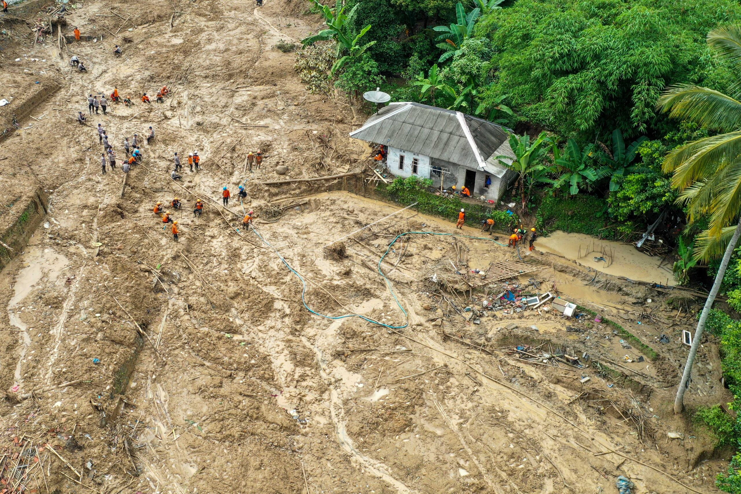 Foto aerial sejumlah anggota Basarnas, TNI dan Polri melakukan pencarian korban tanah longsor di Kampung Sinar Harapan, Desa Harkat Jaya, Kecamatan Sukajaya, Kabupaten Bogor, Jawa Barat, Kamis (9/1/2020). Basarnas memperpanjang masa pencarian selama tiga hari untuk tiga korban banjir bandang dan tanah longsor di kawasan tersebut. ANTARA FOTO/Galih Pradipta/nz