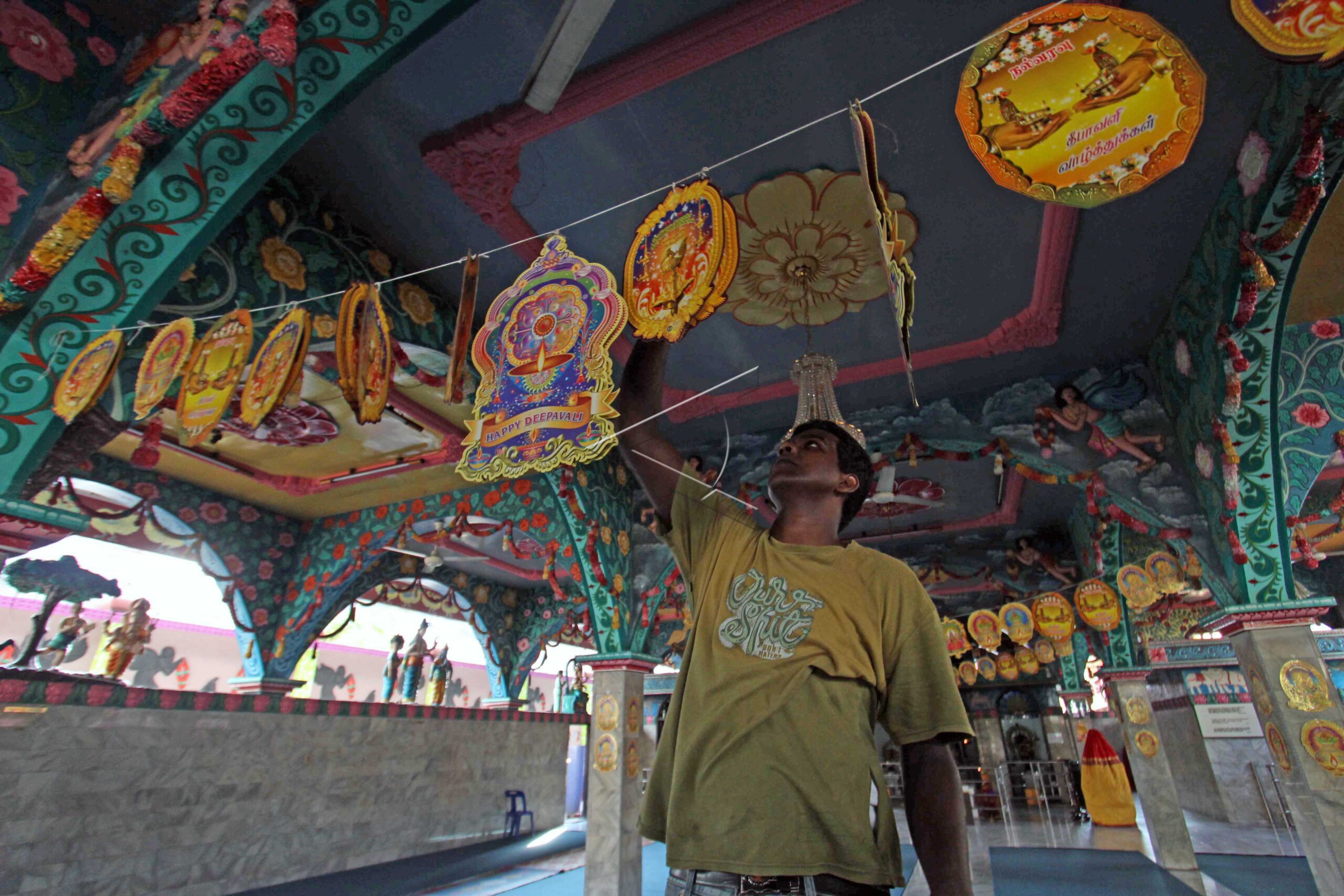 Warga keturunan Tamil menyiapkan aksesoris perayaan Hari Raya Deevapali atau perayaan kemenangan kebaikan atas keburukan di kuil Shri Mariamman Medan, Sumatera Utara, Jumat (28/10/2016). ANTARA FOTO/Septianda Perdana/ama/dw/nym.