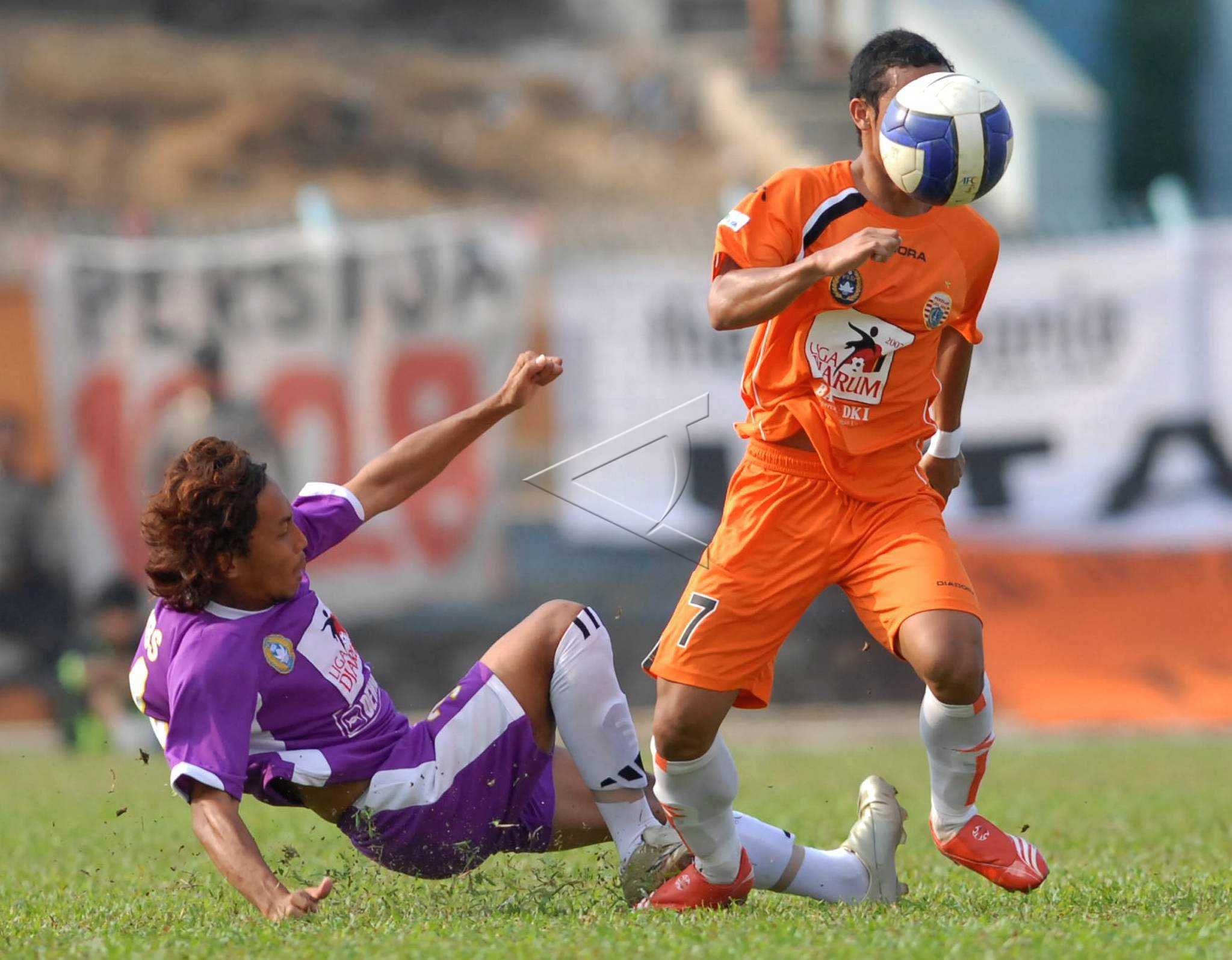 Pemain Persija Jakarta Atep (kanan) berebut bola dengan pemain Persita Tangerang Basri Badussalam (kiri) saat pertandingan lanjutan kompetisi Liga Indonesia 2007 di Stadion Benteng Tangerang, Selasa (7/8/2007). ANTARA FOTO/Andika Wahyu/mes/asf/pras.