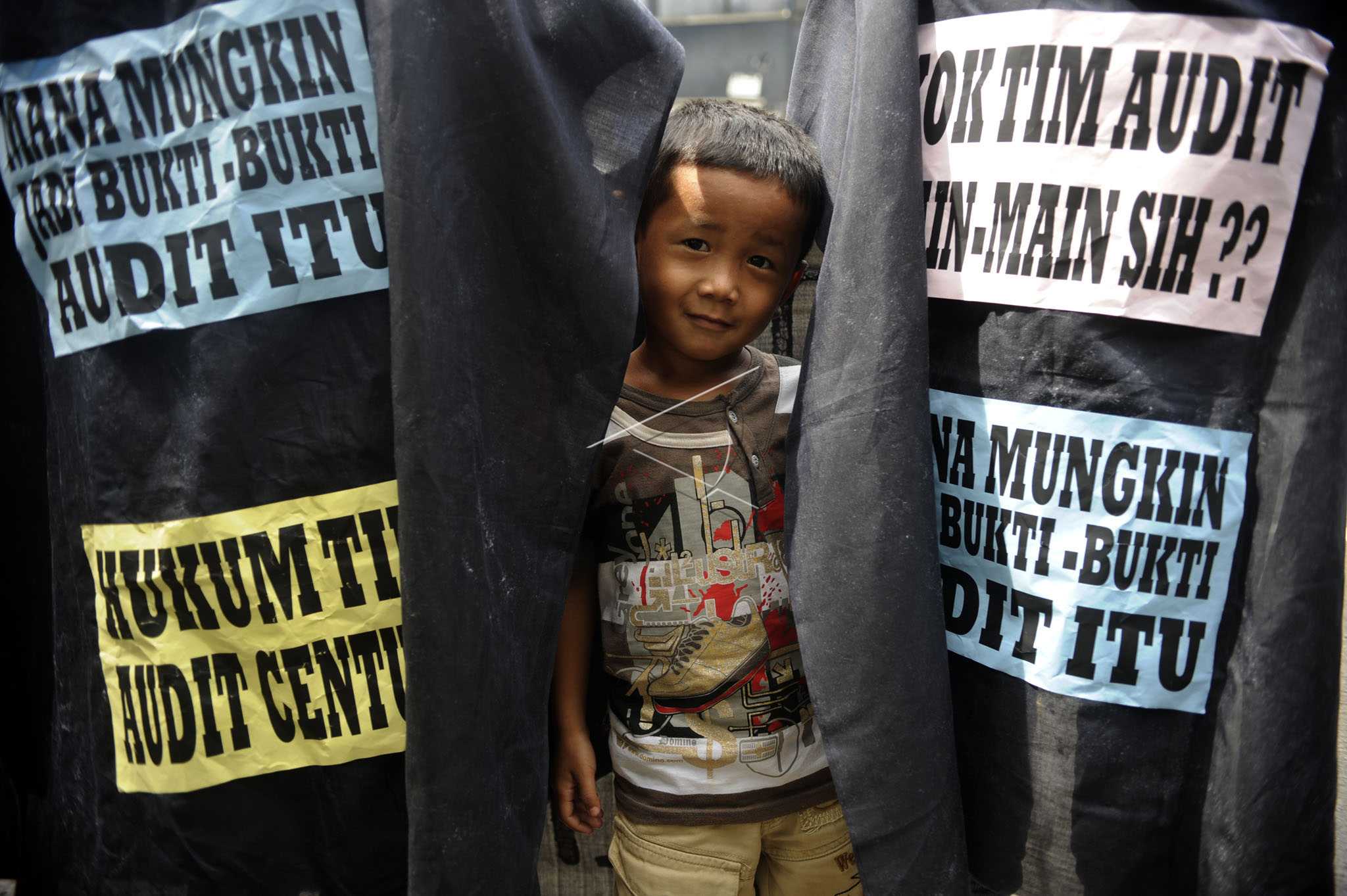 Seorang bocah bersama sejumlah orang yang tergabung dalam Indonesia Audit Watch saat berunjuk rasa mendesak Majelis Kehormatan Kode Etik Badan Pemeriksa Keuangan (BPK) RI untuk melakukan pemeriksaan seluruh tim auditor pembuat dan atau perumus Laporan Hasil Pemeriksaan Investigasi kasus Bank Century, di Kantor BPK, Jakarta, Senin (28/12/2009). ANTARA FOTO/Andika Wahyu/asf/tom.