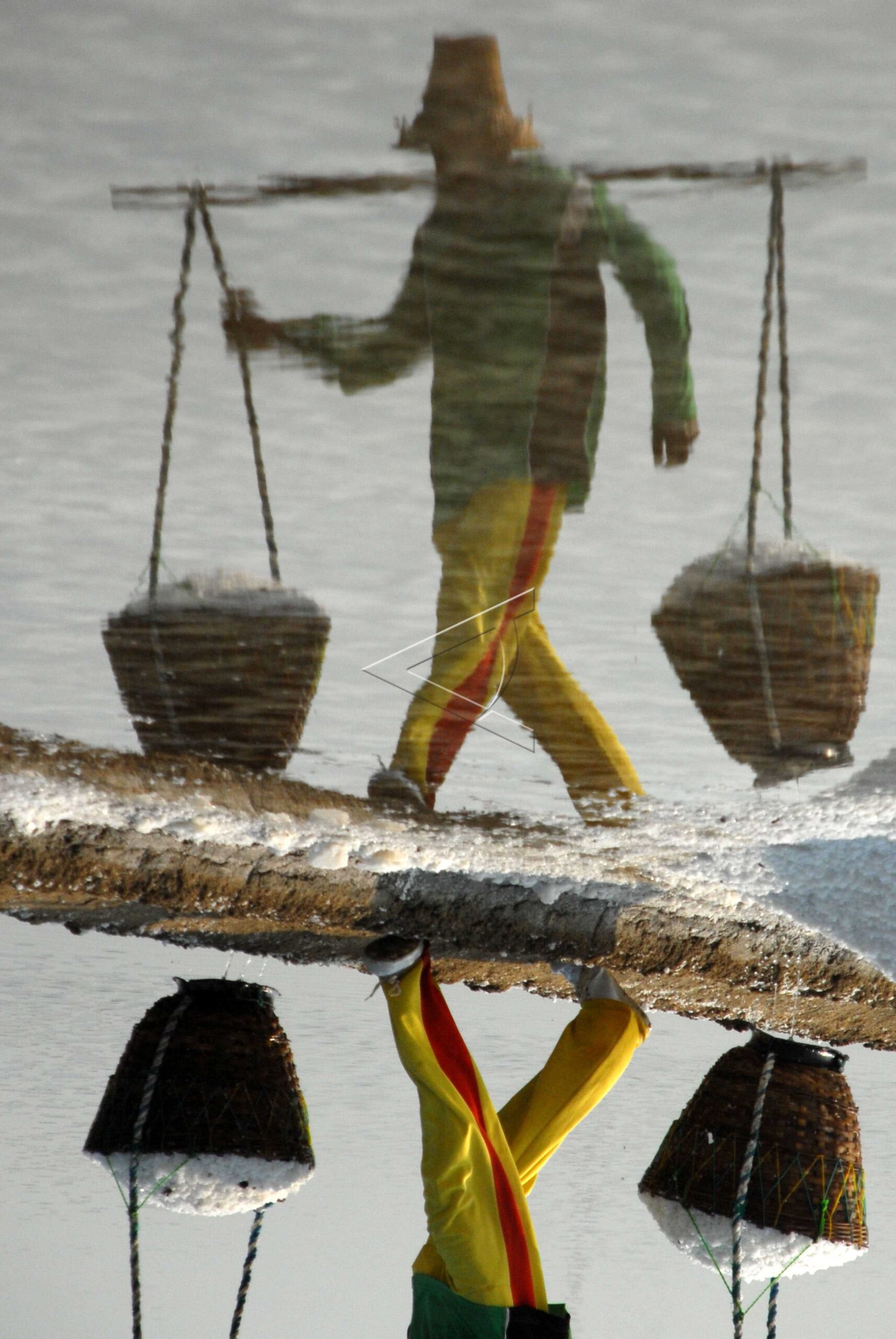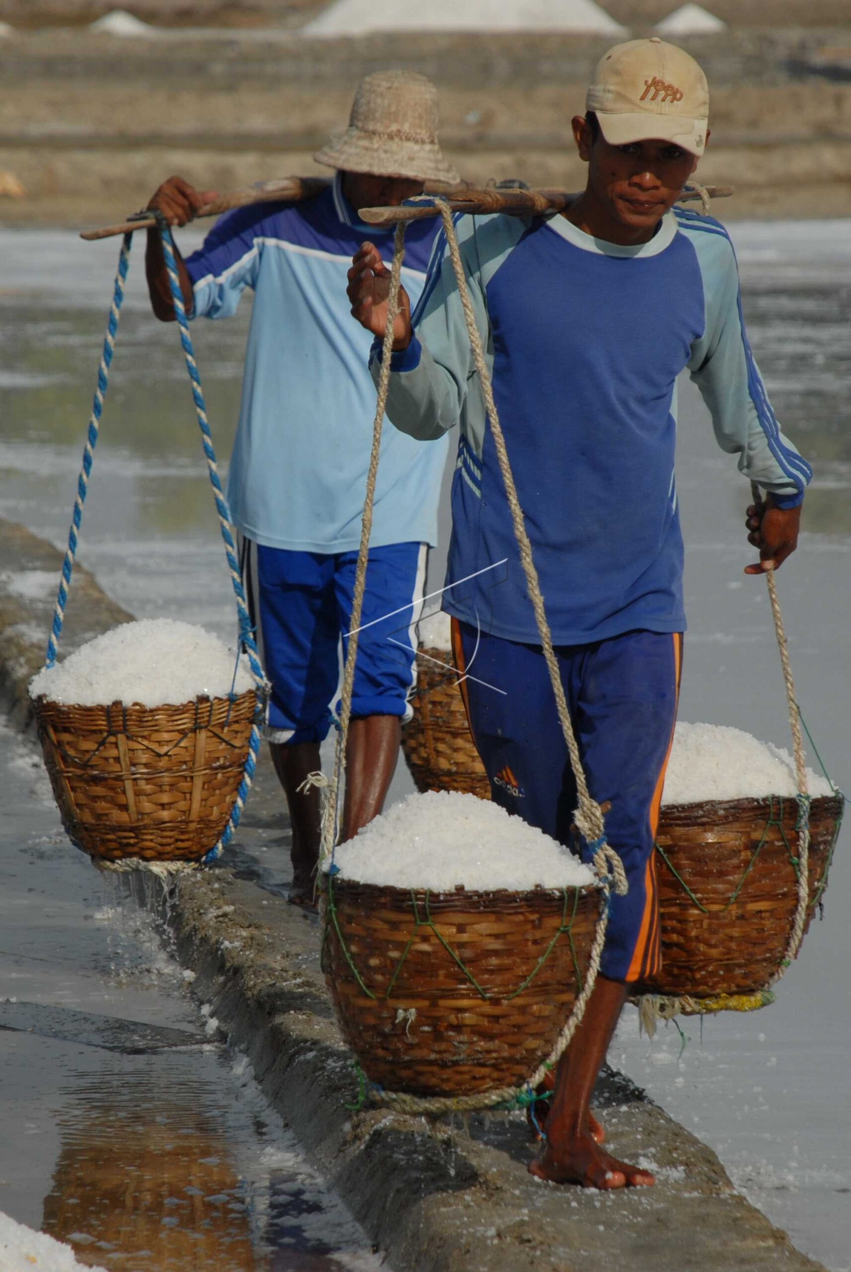 Dua buruh mengangkut garam di Desa Bunder, Pademawu, Pamekasan, Jatim, Kamis (13/9/2012). ANTARA FOTO/Saiful Bahri.