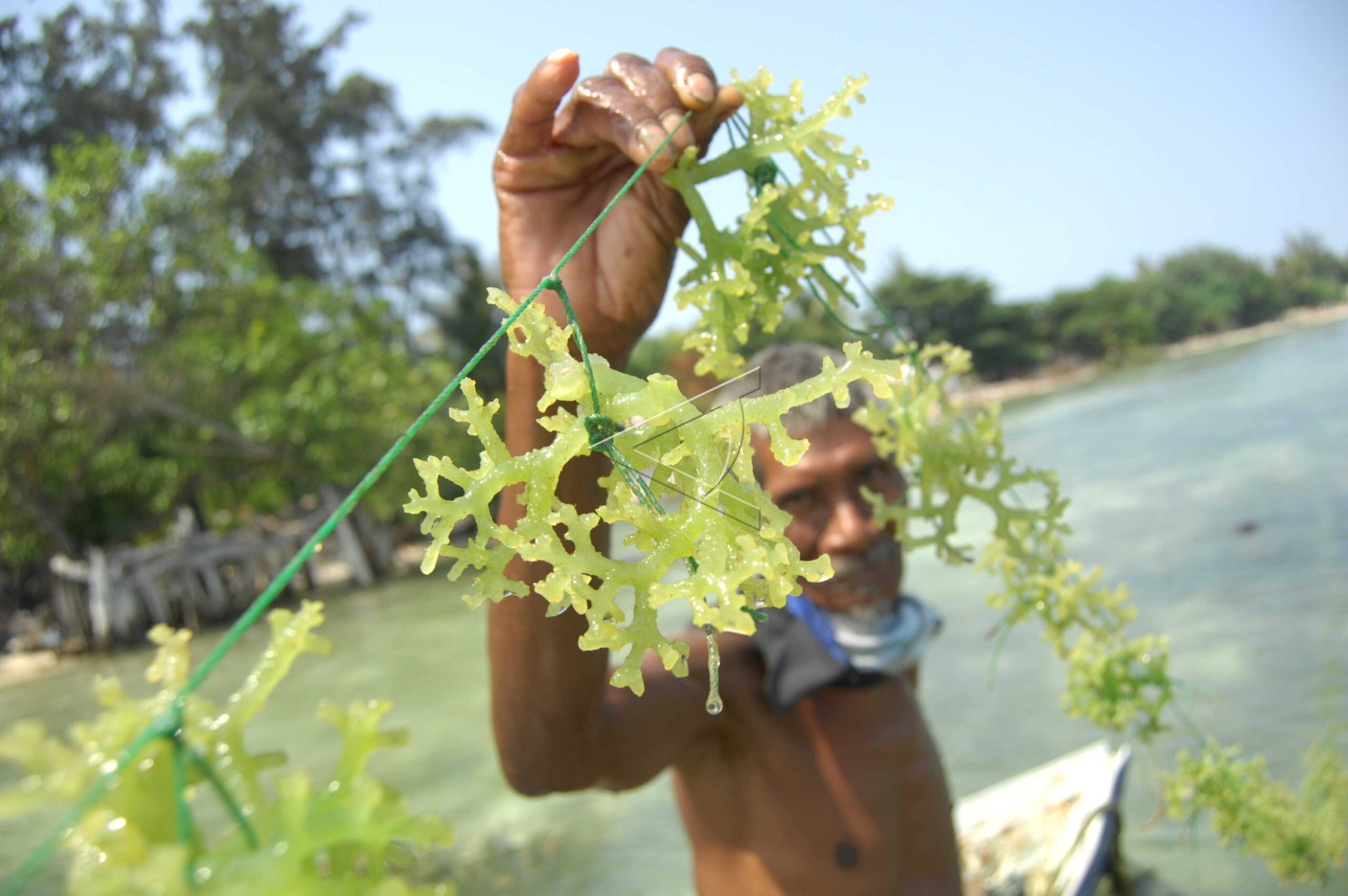 Seorang warga pulau Tidung menunjukkan rumput laut di kawasan Pantai Pulau Tidung, Kepulauan Seribu, Jakarta, Selasa (21/8/2012). ANTARA FOTO/Ardiansyah Indra Kumala./ama/dw/12.