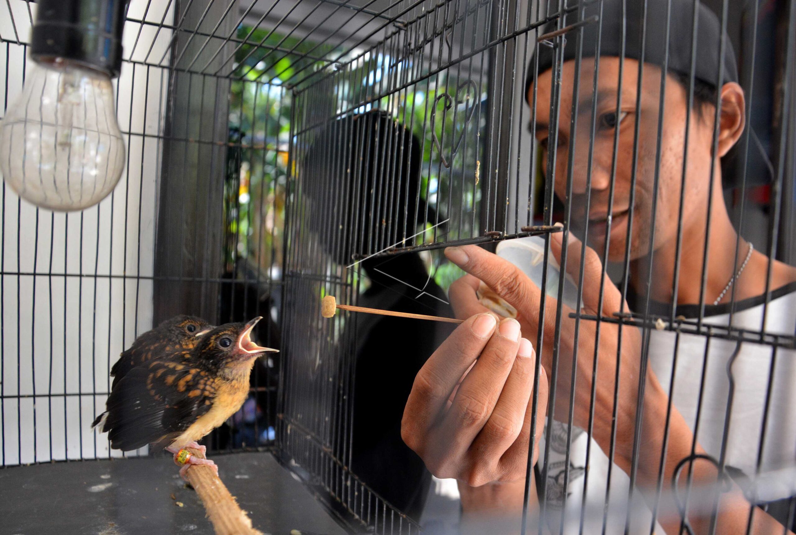Peternak burung Arif Sutejo (30) memberi makan anakan burung murai batu di Dusun Kebonsari, Desa, Karangwinongan, Mojoagung, Jombang, Jawa Timur, Selasa (13/8/2019). ANTARA FOTO/Syaiful Arif/dw/tom.