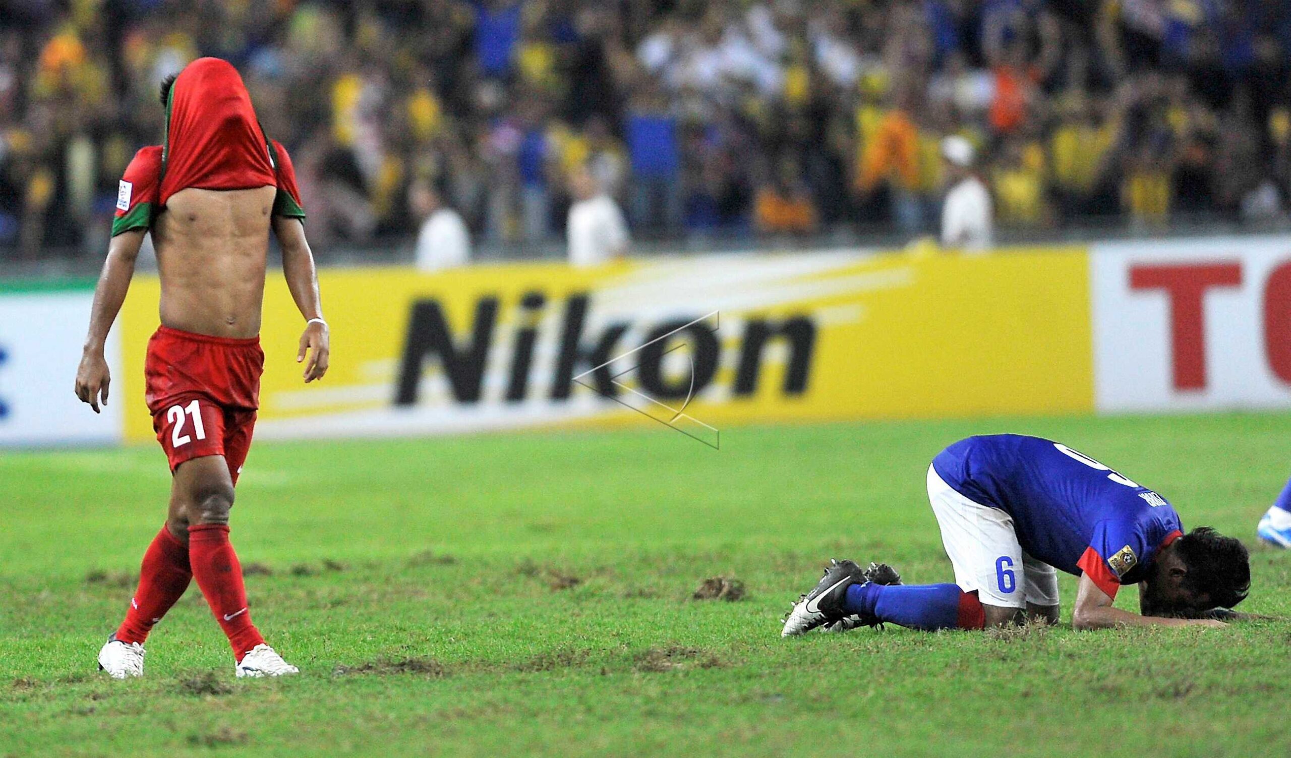 Ekpresi kekecewaan pesepak bola Indonesia Andik Vermansah (kiri) saat dikalahkan Malaysia pada pertandingan babak penyisihan grup B Piala AFF 2012 di stadion Bukit Jalil, Kuala Lumpur, Malaysia, Sabtu (1/12/2012). Indonesia kalah dengan skor 2-0. ANTARA FOTO/Prasetyo Utomo/asf.