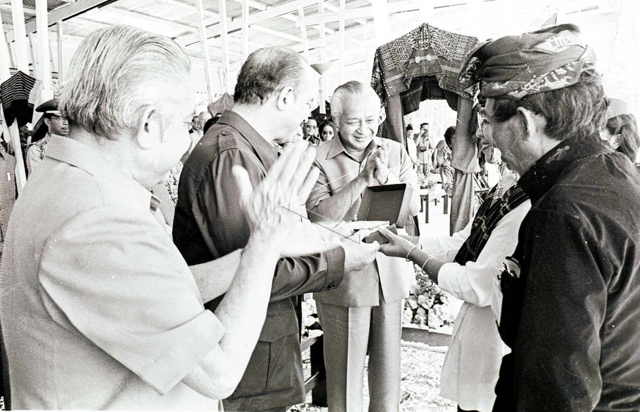 Presiden Soeharto (tengah) menyaksikan penyerahan bantuan para petani Indonesia kepada Dirjen Food and Agriculture Organization (FAO) DR. Edouward Sauma senilai 5 juta Dolar AS untuk rakyat Afrika yang kekurangan pangan, di sela pembukaan Pekan Nasional Kontak Tani Nelayan Andalan (Penas KTNA) di Simalungun, Sumatera Utara, Selasa (22/7/1986). ANTARA FOTO/SD/RN1/asf/nym.