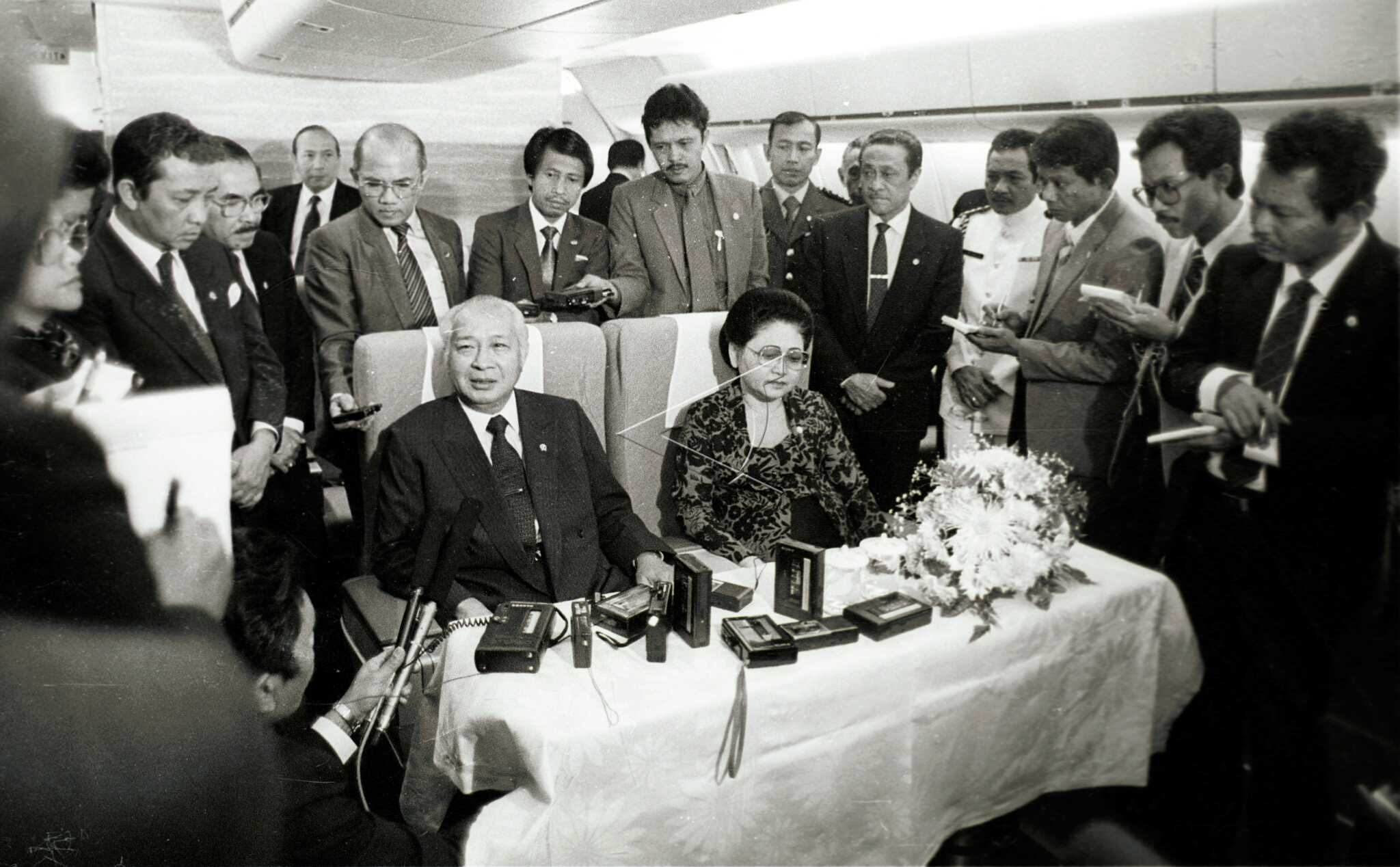 Presiden soeharto (kiri) didampingi Ibu Tien (kanan) saat memberikan keterangan kepada wartawan terkait penghargaan PBB kepada Indonesia di bidang kependudukan saat perjalanan Janewa-Jakarta, Minggu (11/6/1987). ANTARA FOTO/Setneg/H02/H05/asf/yu.