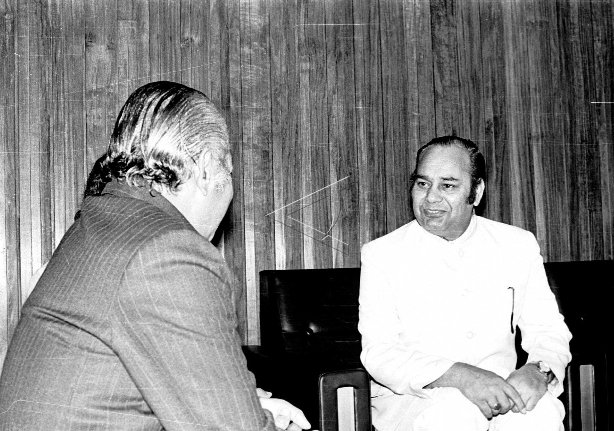 Presiden Soeharto (kiri) tberbincang dengan Menteri Perindustrian India Dr. Charanjit Chanama (kanan) saat melakukan pertemuan di Jakarta, Kamis (8/5/1980). ANTARA FOTO/AR/asf/yu.