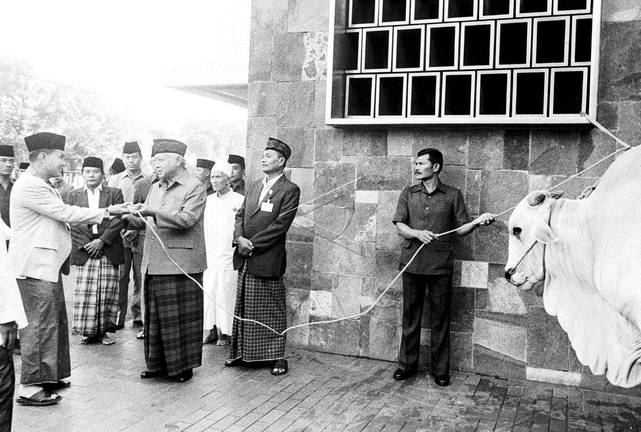 Presiden Soeharto (tengah) dan Wakil Presiden Umar Wirahadikusumah menyerahkan sapi kurban kepada Sekjen Departemen Agama Tarmizi Tahir saat penyerahan sapi qurban usai di Mesjid Istiqlal, Rabu (5/8/1987). ANTARA FOTO/N04/asf/yu.