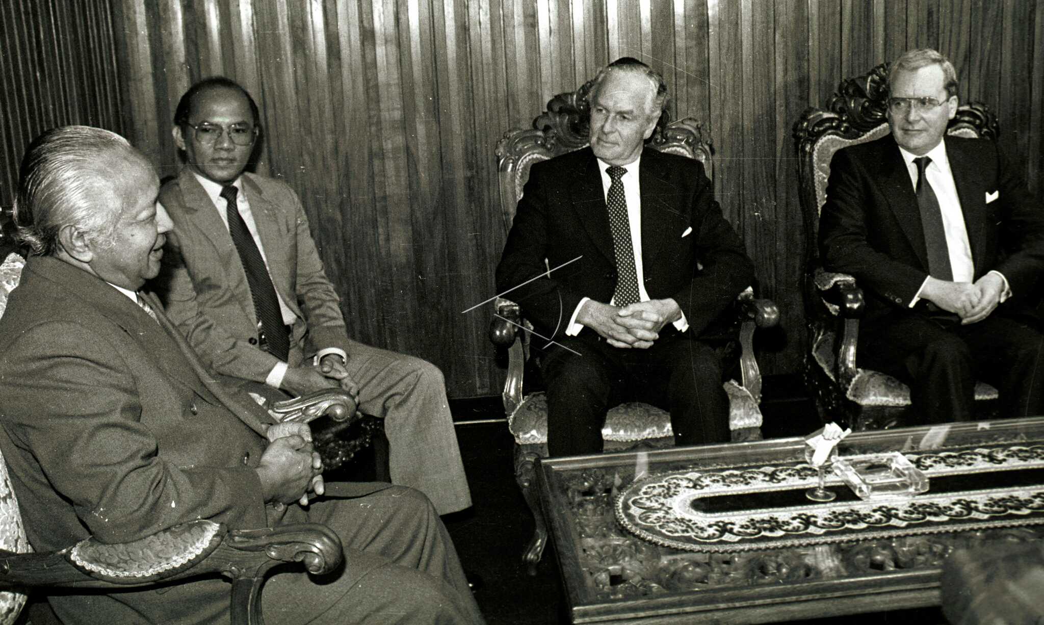 Presiden Soeharto (kiri) berbincang dengan Pimpinan Burman Oil John N. Malty (kedua kanan) saat melakukan pertemuan yang membahas peningkatan investasi Burman Oil di indonesia terutama gas alam cair (LNG) di Bina Graha Jakarta, Senin (20/10/1986). ANTARA FOTO/N03/N01/asf/yu.