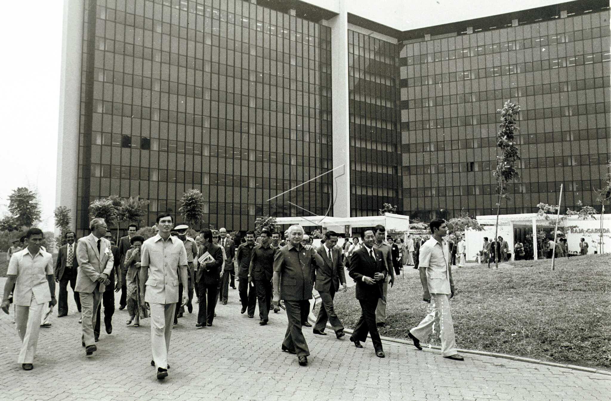 Presiden Soeharto (tengahi) didampingi Menteri Kehutanan Sudjarwo (kedua kanan) meninjau pemakaian / pemanfaatan gedung Pusat Kehutanan yang dilengkapi taman dan Museum Hutan yaitu gedung di atas tanah seluas 12 hektare dengan biaya Rp.50 milyar, seusai peresmian gedung tersebut di Jakarta, Rabu (24/6/1983). ANTARA FOTO/P06/asf/nym.