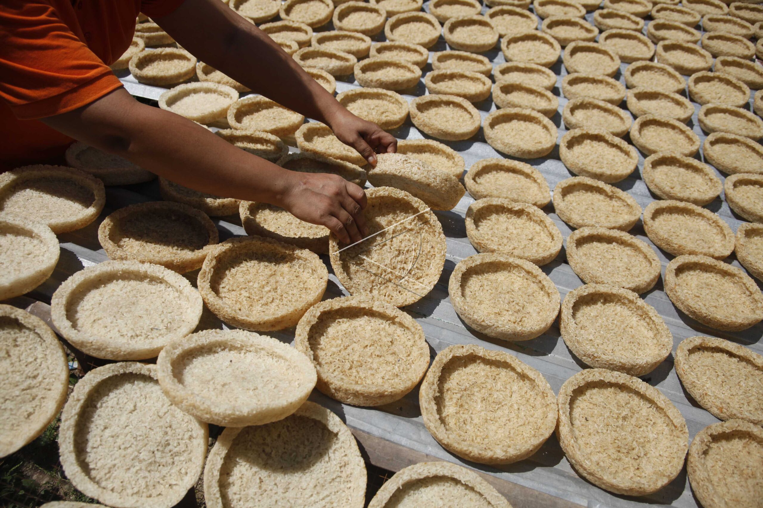 Pekerja menjemur nasi untuk bahan pembuatan makanan ‘intip kendil’ di Palur, Karanganyar, Jawa Tengah, Selasa (21/05/2019). ANTARA FOTO/Maulana Surya/foc/dw.