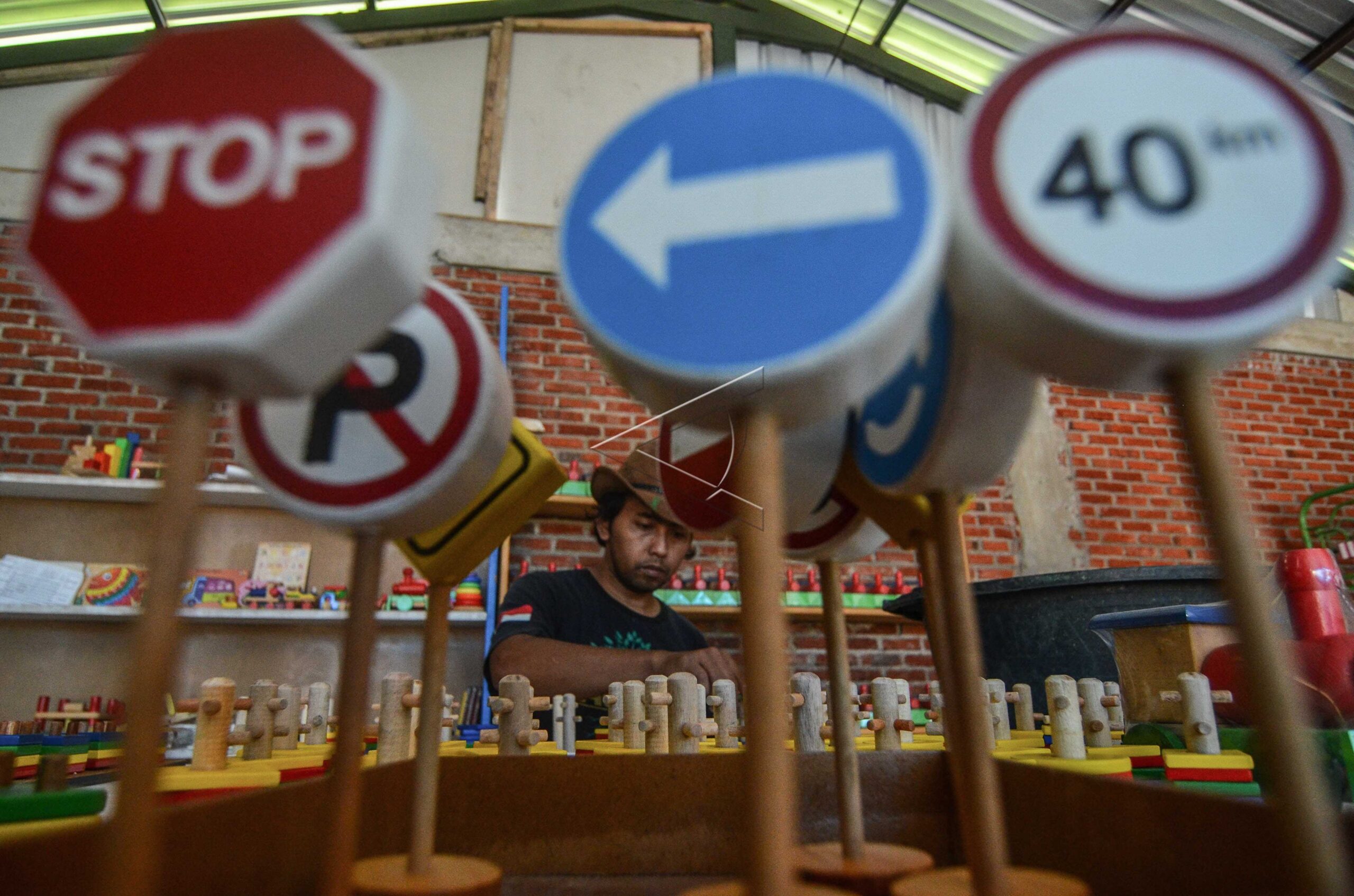 Perajin menyusun alat permainan edukatif anak berbahan kayu, di Sanggar Anakita Toyz, Kampung Depok, Tasikmalaya, Jawa Barat, Selasa (18/6/2019). ANTARA FOTO/Adeng Bustomi/dw/tom.
