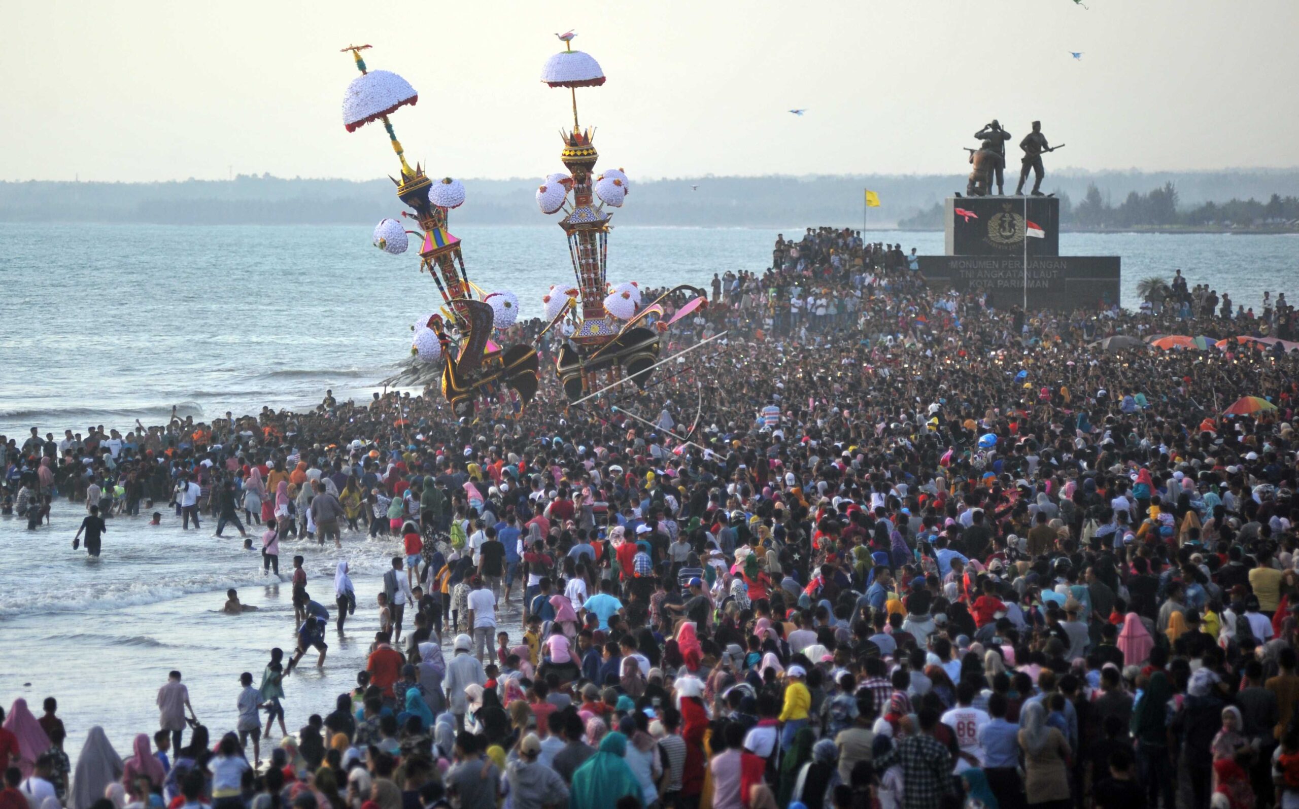 Dua Tabuik bersiap dibuang ke laut saat puncak Pesona Hoyak Tabuik Piaman untuk memperingati Asyura (10 Muharram) 1441 H di Pantai Pariaman, Sumatera Barat, Minggu (15/9/2019). ANTARA FOTO/Iggoy el Fitra/aww/dw/nym.