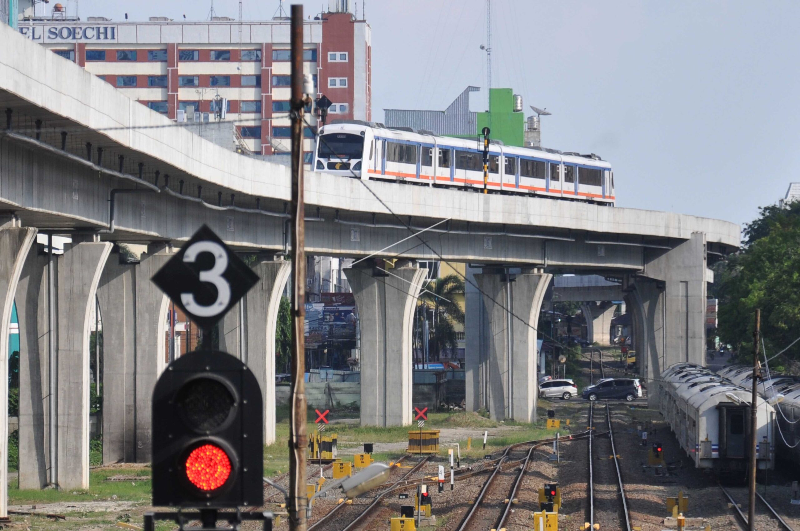 Kereta api bandara Railink melintas di jalur layang di Stasiun Besar Medan, Sumatera Utara, Minggu (29/3/2020). Manajemen PT Railink sudah melakukan pengurangan dari 38 kali perjalanan dari 50 kali perjalanan normal kereta api Bandara Kualanamu per hari untuk mendukung upaya pemerintah mencegah penyebaran virus COVID-19. ANTARA FOTO/Septianda Perdana/foc.