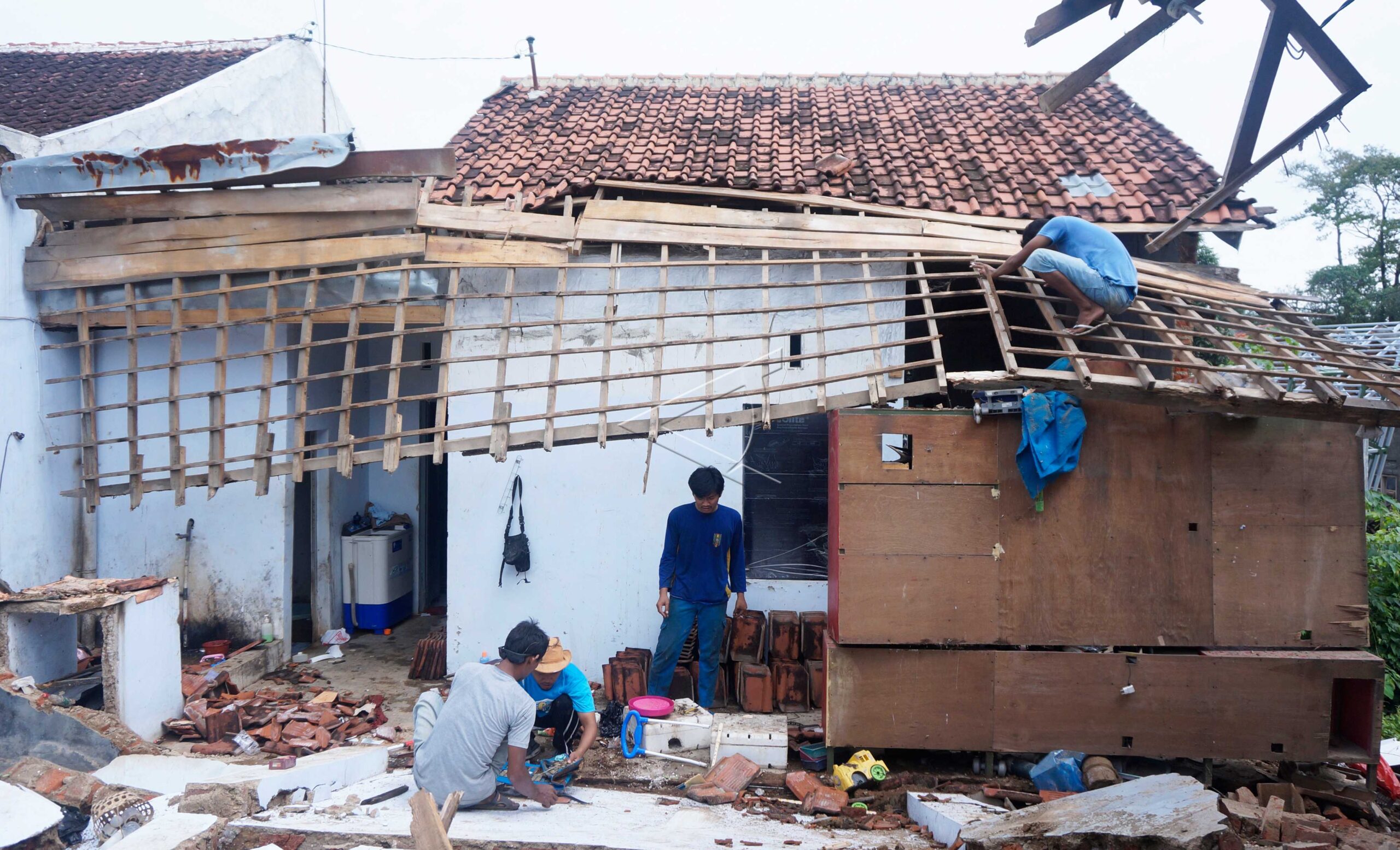 Warga bergotong royong membersihkan reruntuhan rumah di Perumahan Pesona Griya Desa Kulu, Karanganyar, Kabupaten Pekalongan, Jawa Tengah, Rabu (8/1/2019). Berdasarkan data Badan Penanggulangan Bencana Daerah (BPBD) Kabupaten Pekalongan, sebanyak tujuh rumah terdampak hujan deras dan angin kencang pada Selasa (7/1) malam dengan kondisi beberapa tembok rumah roboh dan longsor. ANTARA FOTO/Harviyan Perdana Putra/wsj.