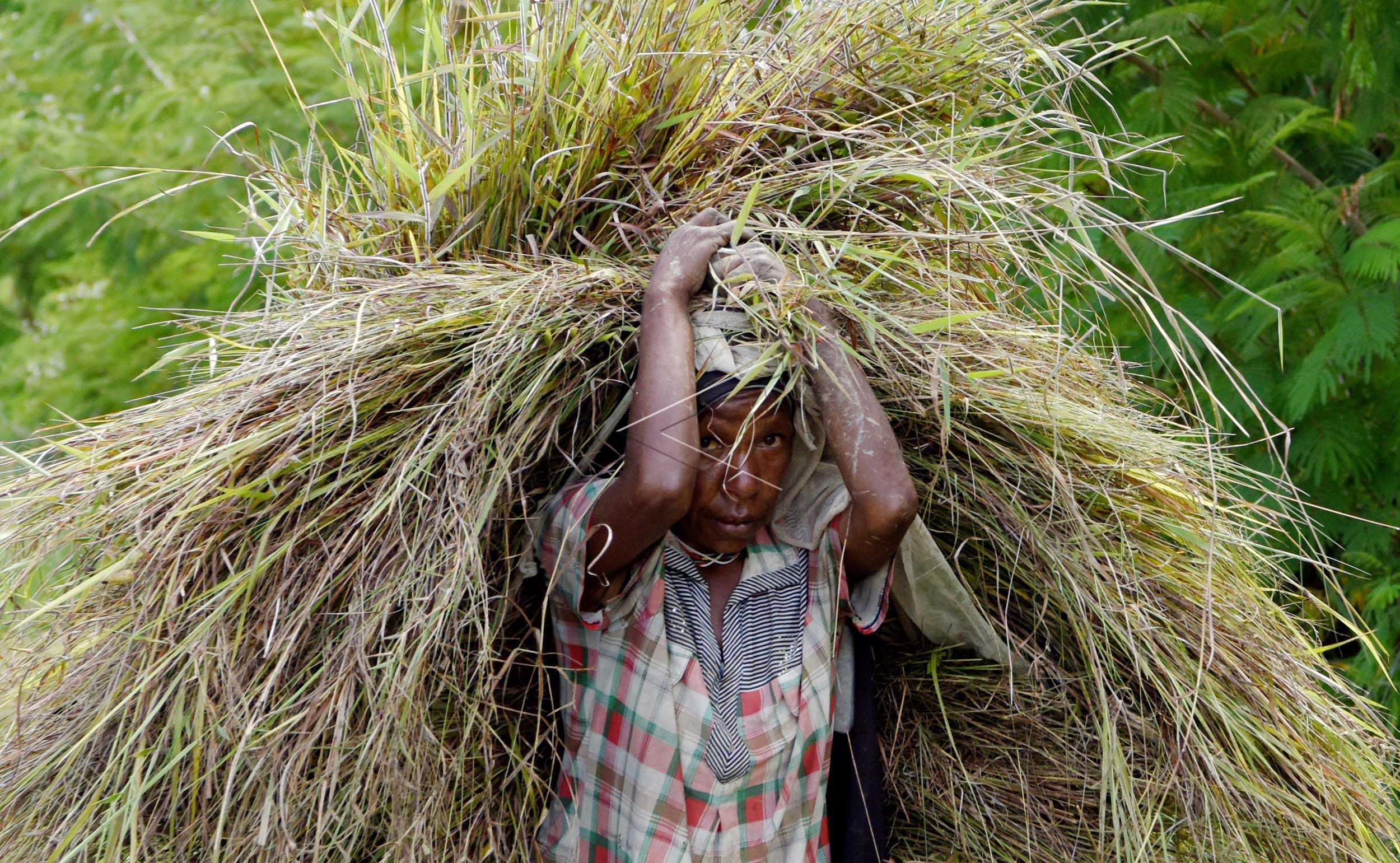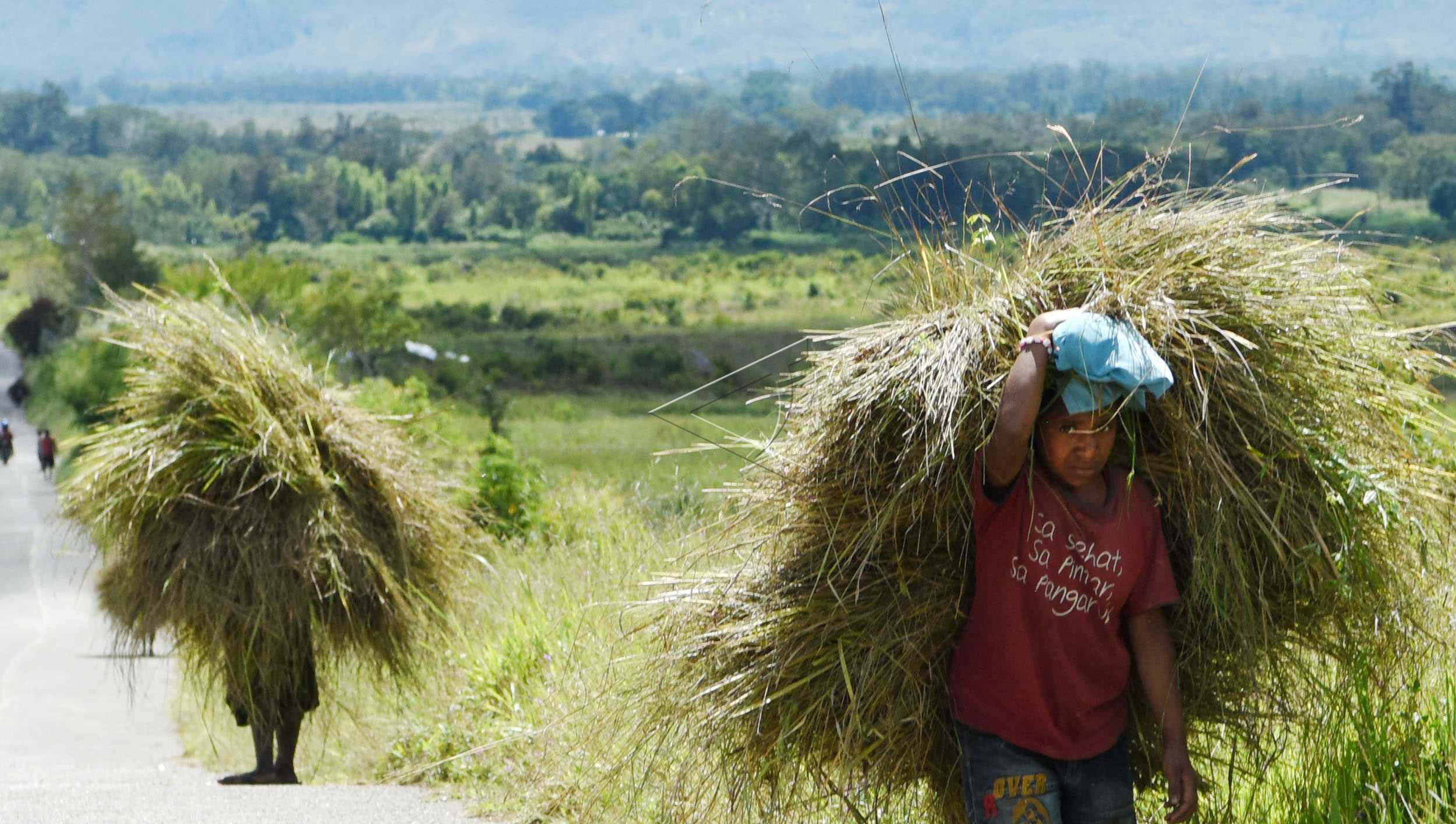Warga memanggul rumput ilalang untuk bahan atap rumah honai di Wamena, Kabupaten Jayawijaya, Papua, Senin (15/4/2019). ANTARA FOTO/Yusran Uccang/ama/dw/nym.