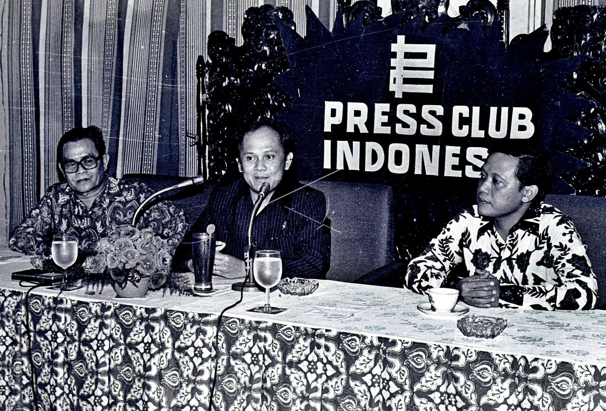Menteri Negara Riset dan Teknologi BJ Habibie (tengah) didampingi Ketua PWI Pusat Harmoko (kanan) memberikan pengarahan dihadapan pimpinan redaksi harian ibukota, di Press Club Jakarta (10/8/1978). ANTARA FOTO/Mawardi Muis/Sr/asf/tom.