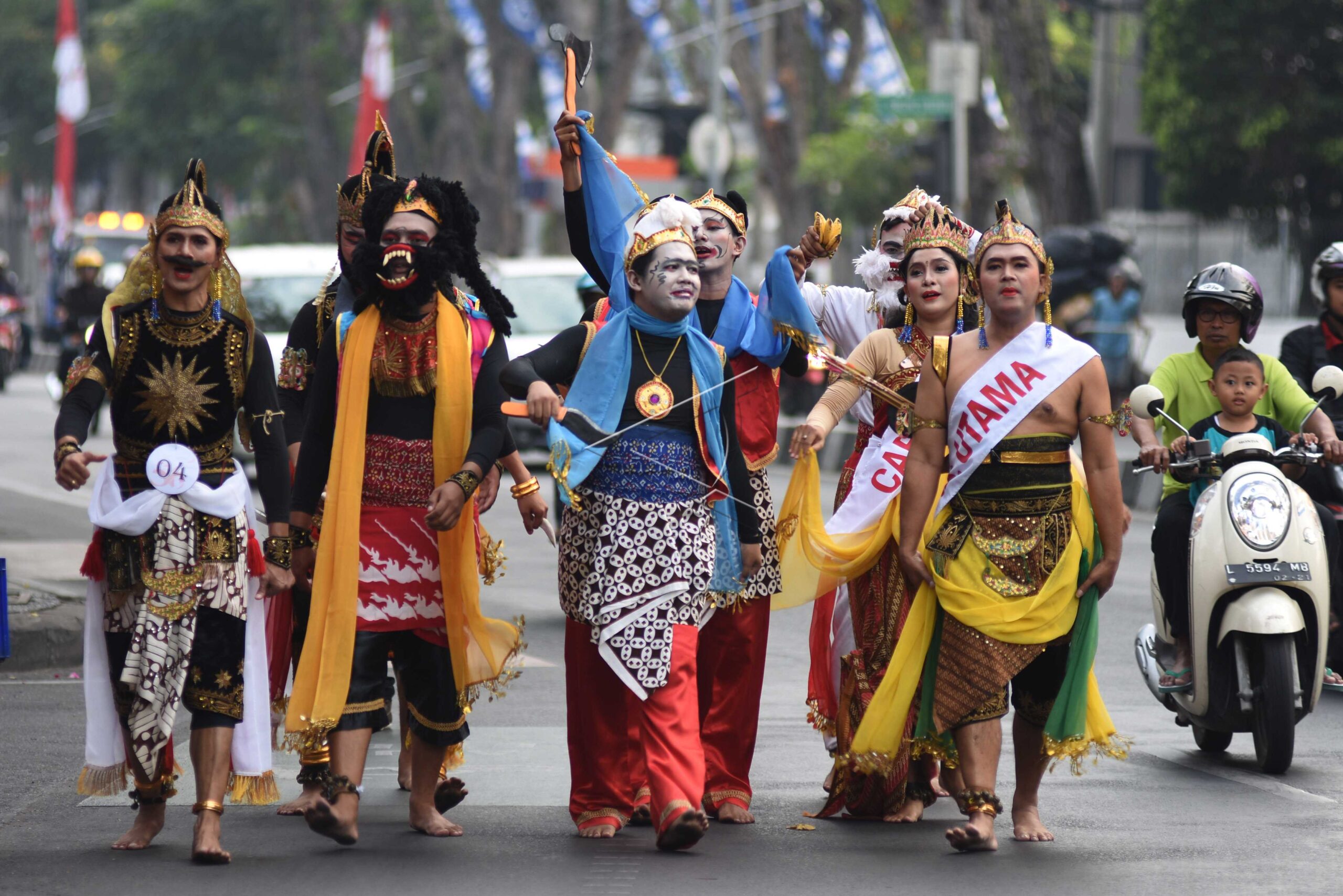 Sejumlah peserta dengan kostum perwayangan mengikuti jalan sehat dalam rangka HUT ke-72 RI dan HUT ke-56 Bank Jatim, saat melintas di jalan protokol Surabaya, Jawa Timur, Sabtu (19/8/2017). ANTARA FOTO/M Risyal Hidayat/foc/dw/nym.