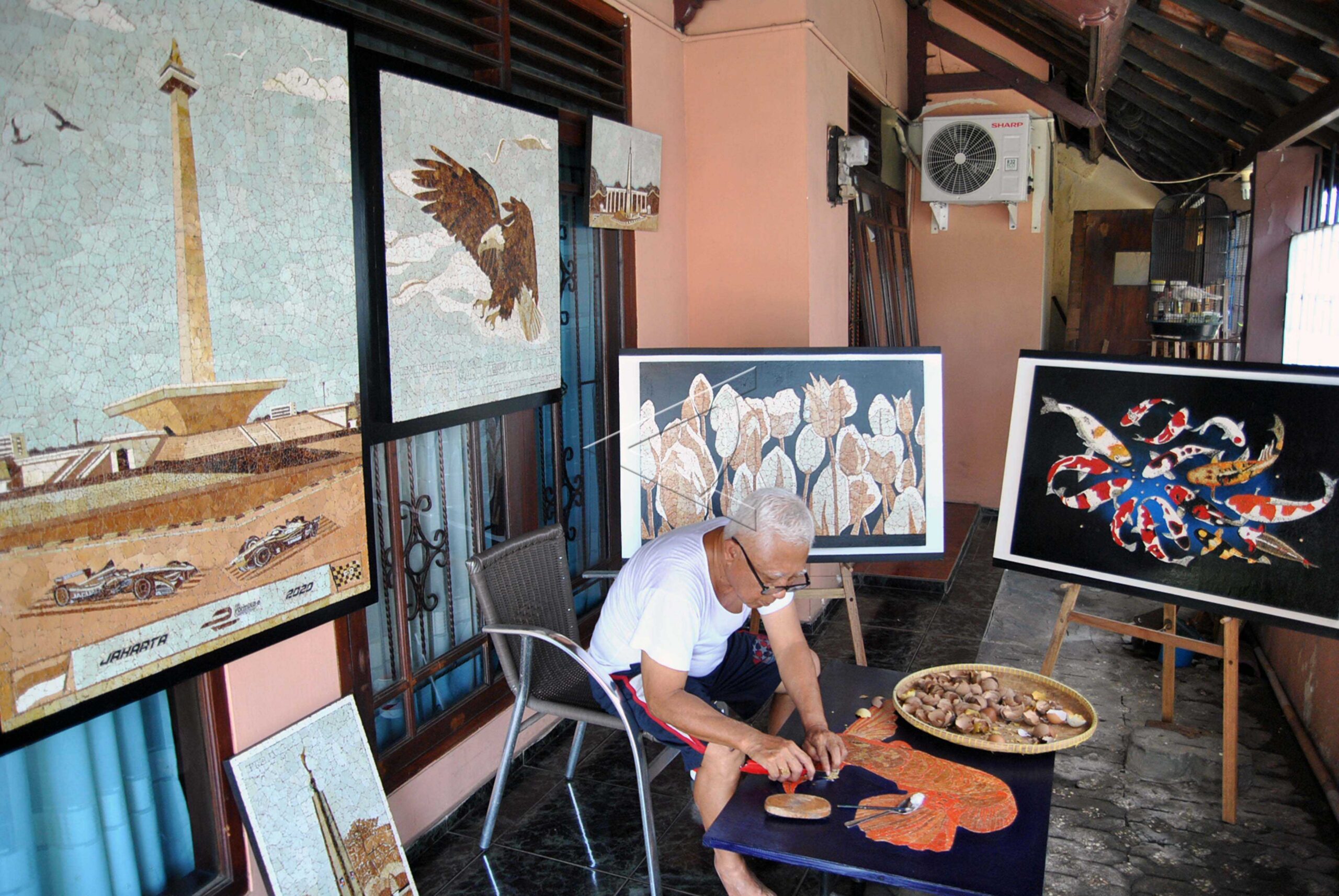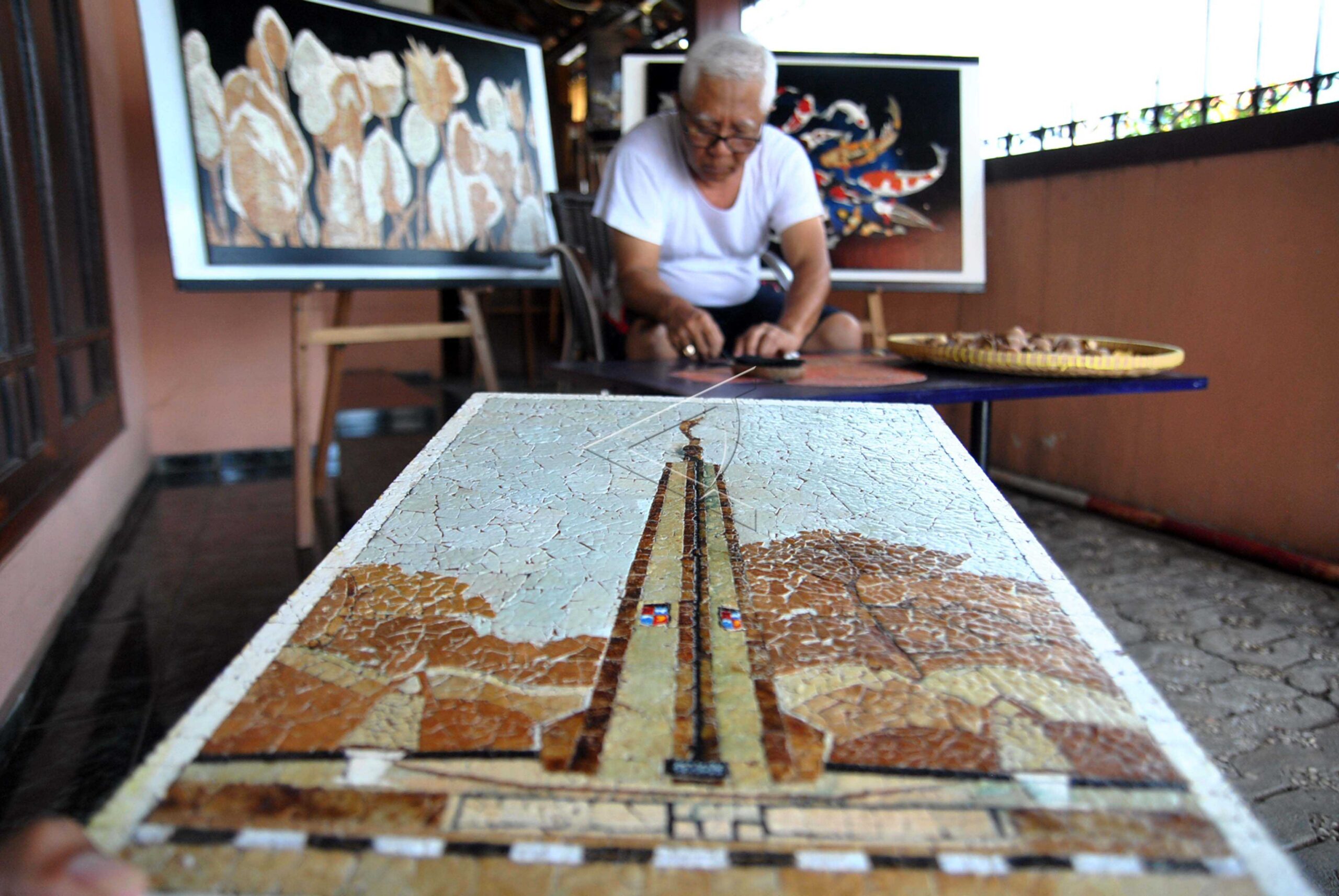 Seniman Bambang Sriyanto menyelesaikan pembuatan lukisan limbah cangkang telur di rumahnya Perumnas Bantarjati, Kota Bogor, Jawa Barat, Senin (11/02/2020). Berbagai tema lukisan limbah cangkang telur tersebut mampu diselesaikan dalam waktu satu hingga dua bulan. ANTARA FOTO/Arif Firmansyah/foc.