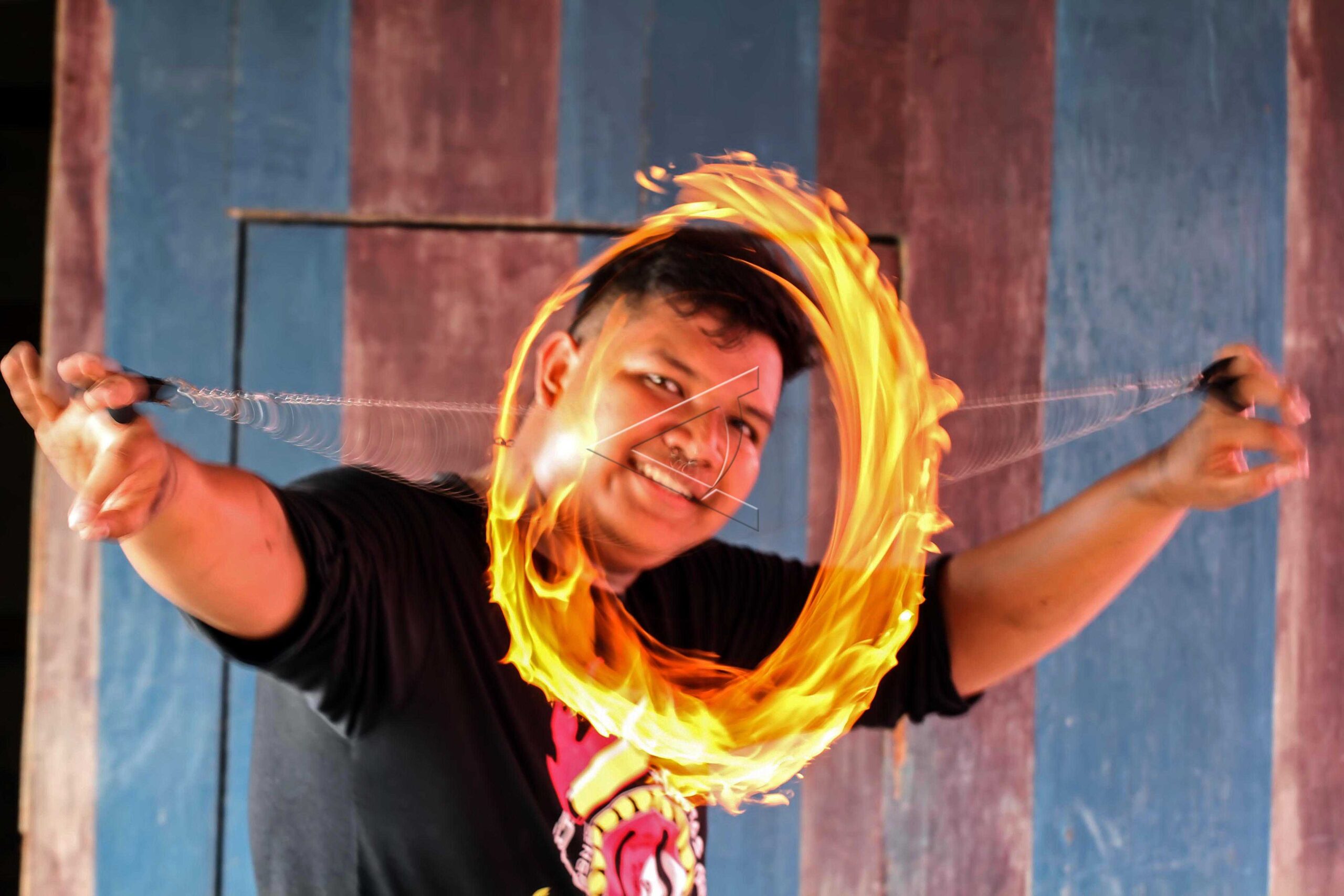 Anggota komunitas Indonesian Nunchaku Club Region Aceh menunjukkan seni permainan api (fire poi) di Lhokseumawe, Aceh, Minggu (7/4/2019). ANTARA FOTO/Rahmad/foc/dw/nym.