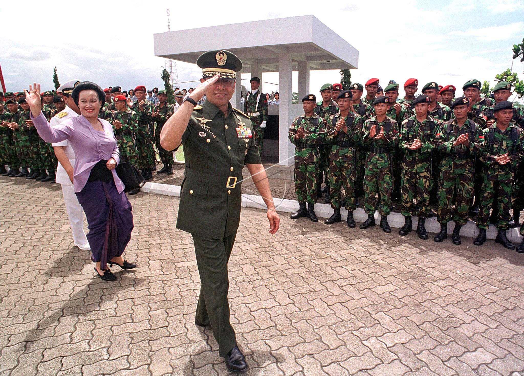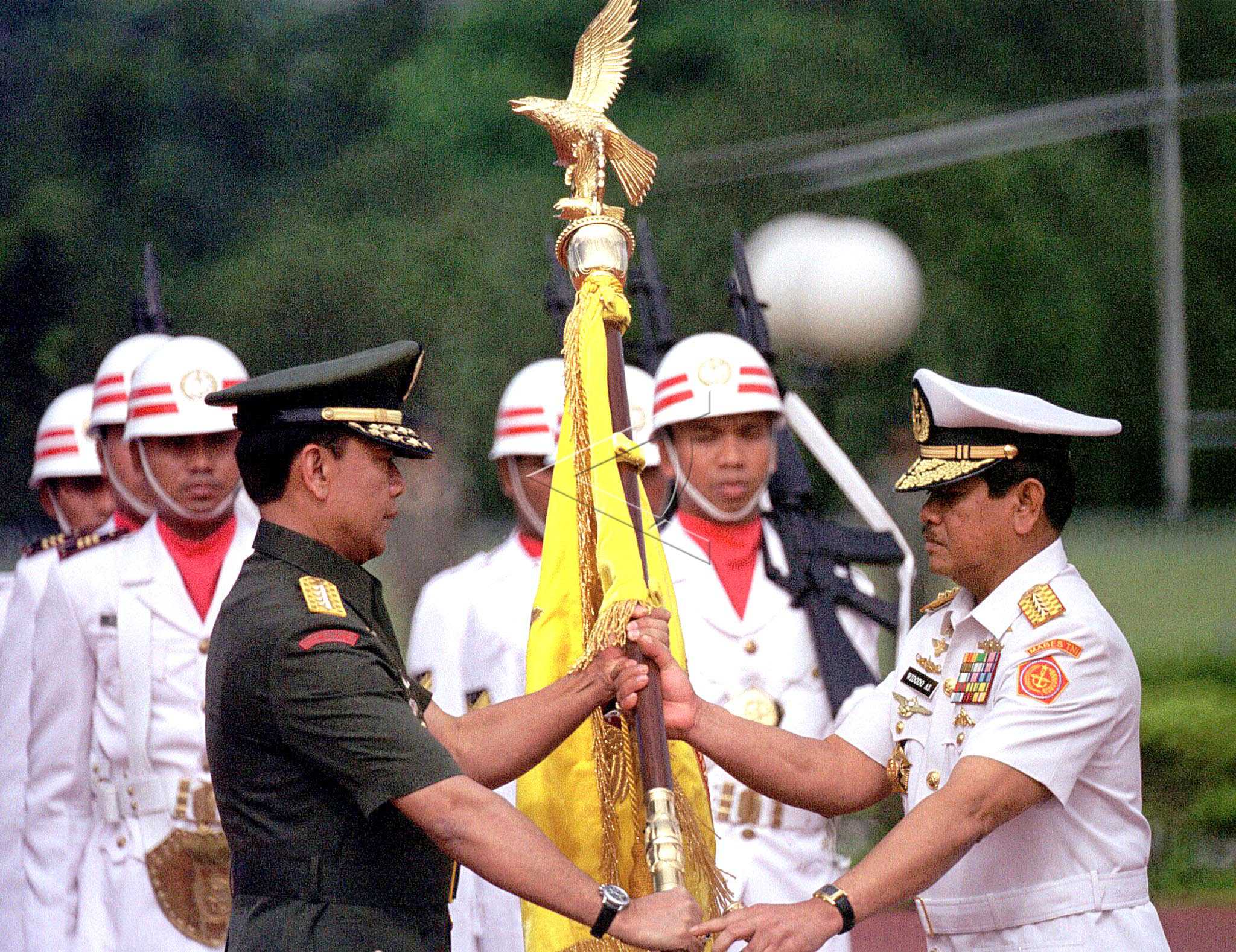 Jenderal TNI Wiranto (kiri) menyerahkan Pataka TNI kepada penggantinya Laksamana TNI Widodo AS sebagai Panglima TNI pada upacara serah terima jabatan, di Mabes TNI Cilangkap, Jakarta, Kamis (4/11/1999). ANTARA FOTO/Mosista Pambudi/asf/tom.