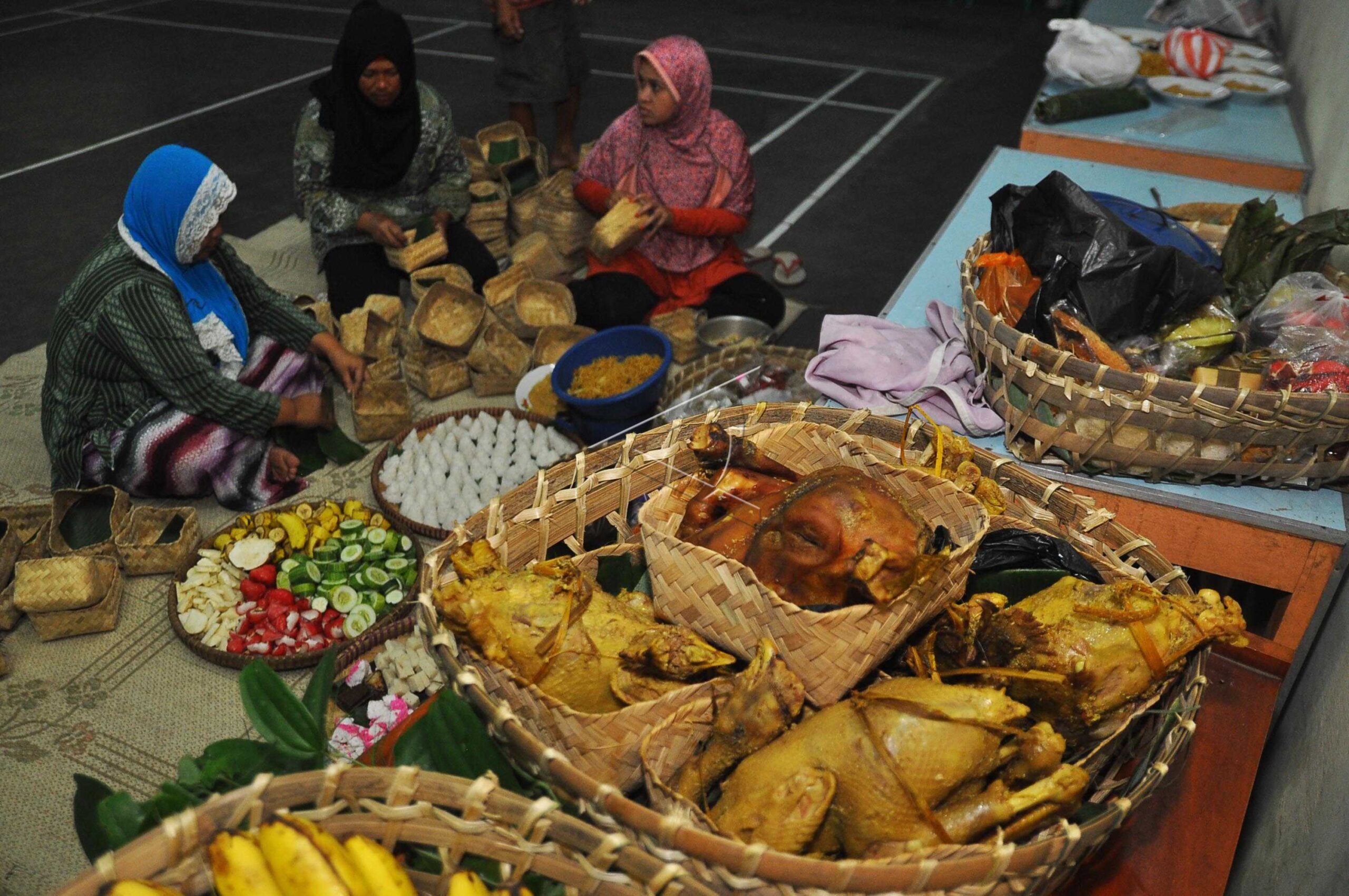 Sejumlah warga menata sesaji untuk ritual menyambut malam satu Sura (Suro) di Traji, Parakan, Temanggung, Jateng, Sabtu (1/10/2016). Bagi sebagian masyarakat Jawa, Sura atau Muharram dipercaya merupakan bulan yang sakral sehingga sejumlah ritus tradisi lazim diselenggarakan untuk menyambut datangnya bulan Sura. ANTARA FOTO/Anis Efizudin/kye/dw/hp.