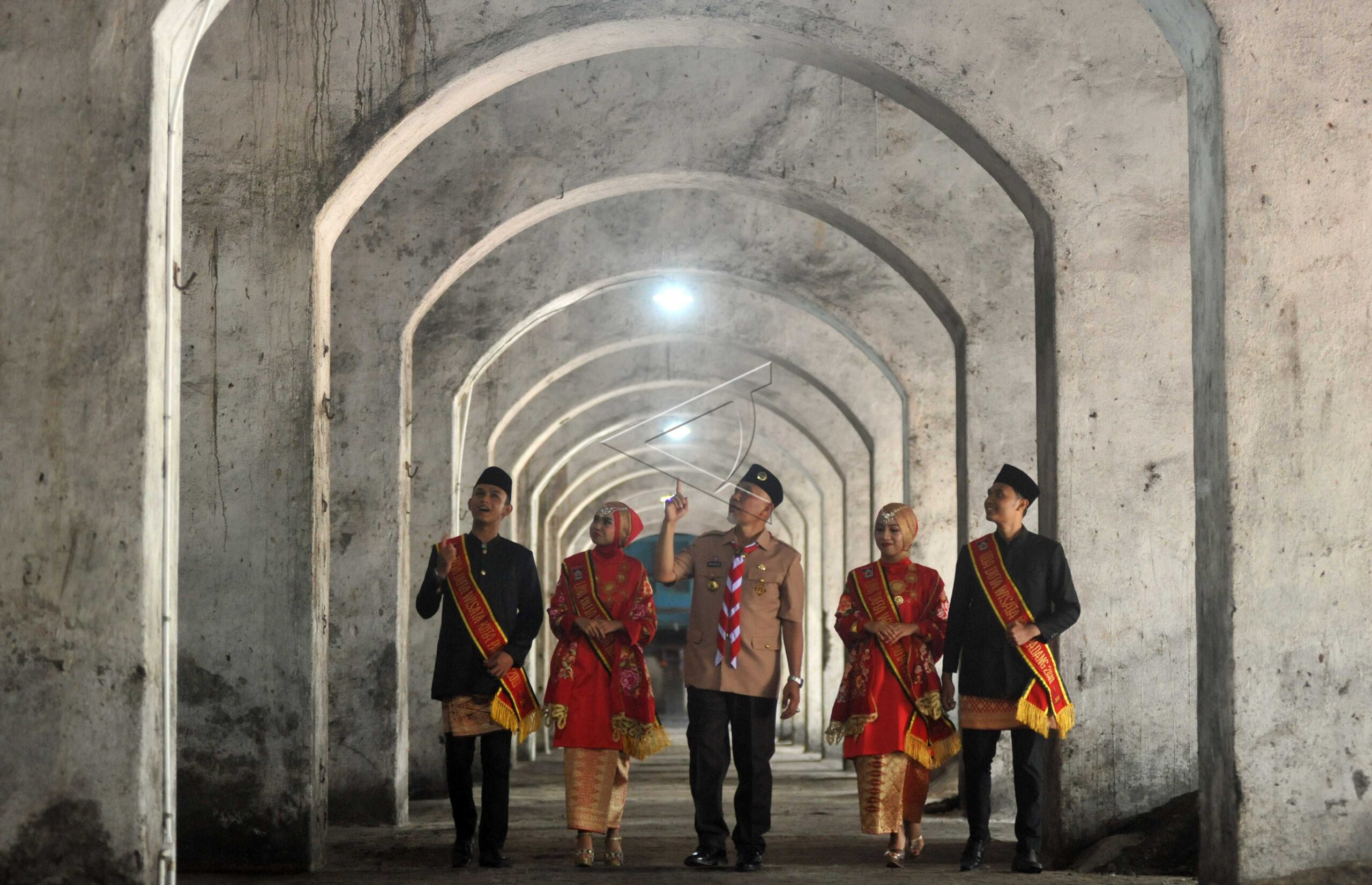 Wali Kota Padang Mahyeldi (tengah), didampingi duta pariwisata melihat bangunan Silo Gunung yang merupakan bekas gudang penampungan batubara di Pelabuhan Teluk Bayur, Padang, Sumatera Barat, Selasa (29/10/2019). ANTARA FOTO/Iggoy el Fitra/dw/tom.