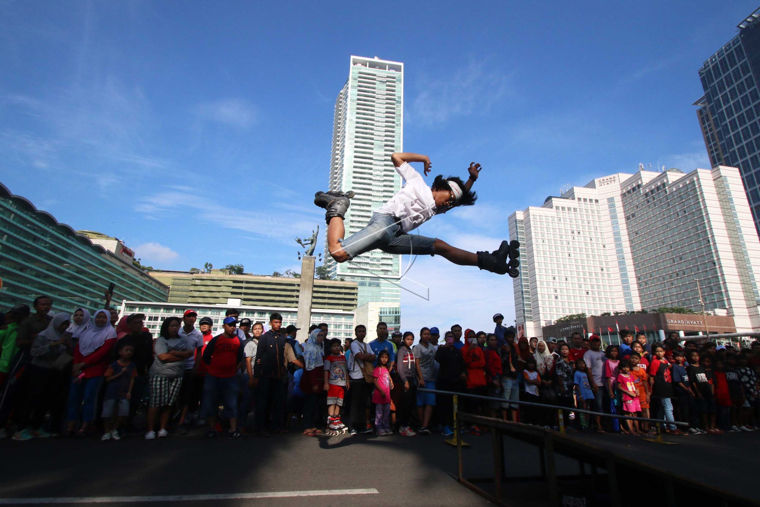 Komunitas sepeda dan sepatu roda unjuk kebolehan saat pelaksanaan Hari Bebas Kendaraan Bermotor (HBKB) di Jakarta, Minggu (12/3/2017). ANTARA FOTO/Rivan Awal Lingga/foc/dw/nym.