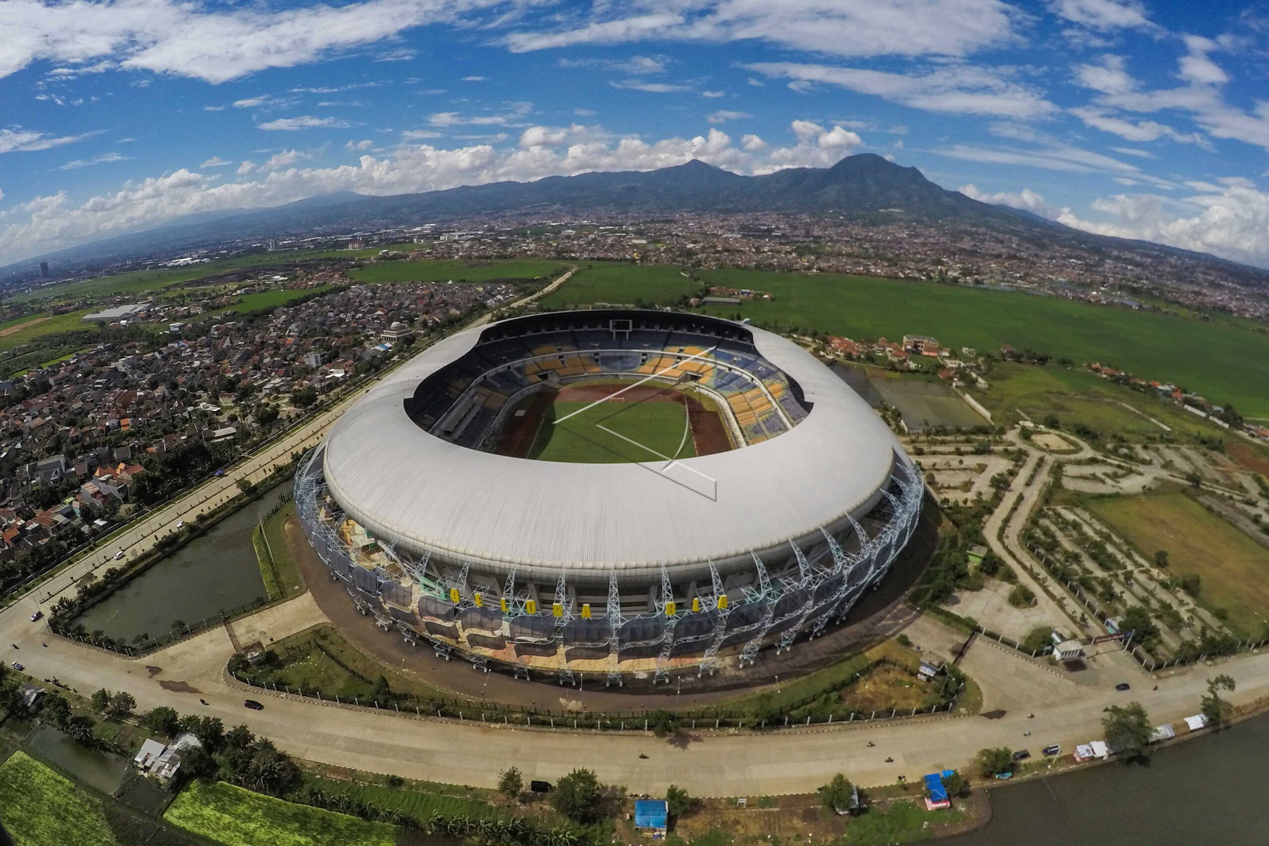 Foto udara Stadion Gelora Bandung Lautan Api (GBLA) di Gedebage, Bandung, Jawa Barat, Jumat (16/2/2018). ANTARA FOTO/Raisan Al Farisi/dw/pras.