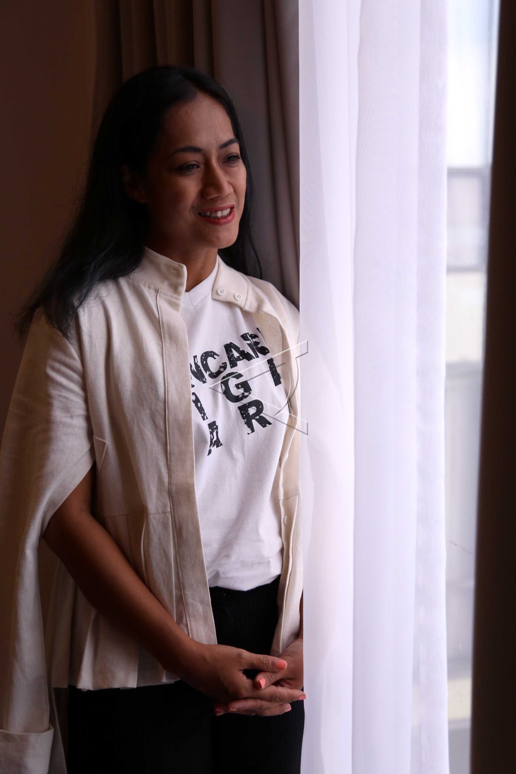Sineas Indonesia Nia Dinata berpose usai menggelar konfrensi pers Mencari Tiga Dara yang terinspirasi dari film musikal karya sutradara legendaris Usmar Ismail pada tahun 1956, di Jakarta, Senin (11/1/2016). ANTARA FOTO/Teresia May/pd/dw/nym.