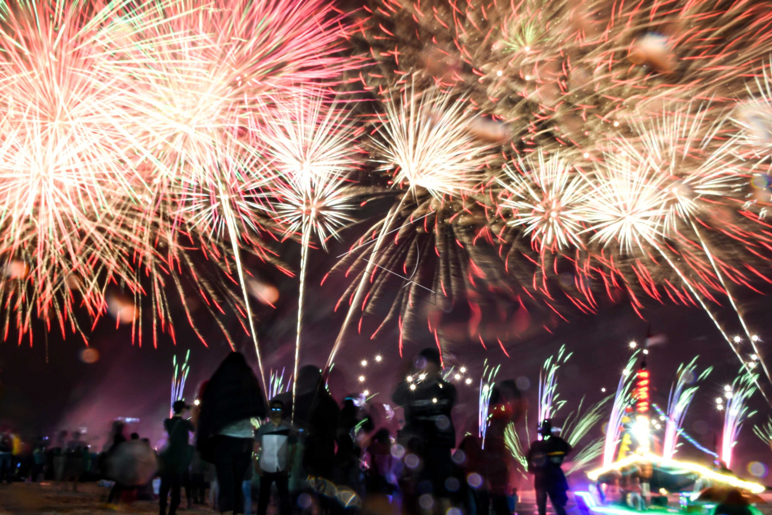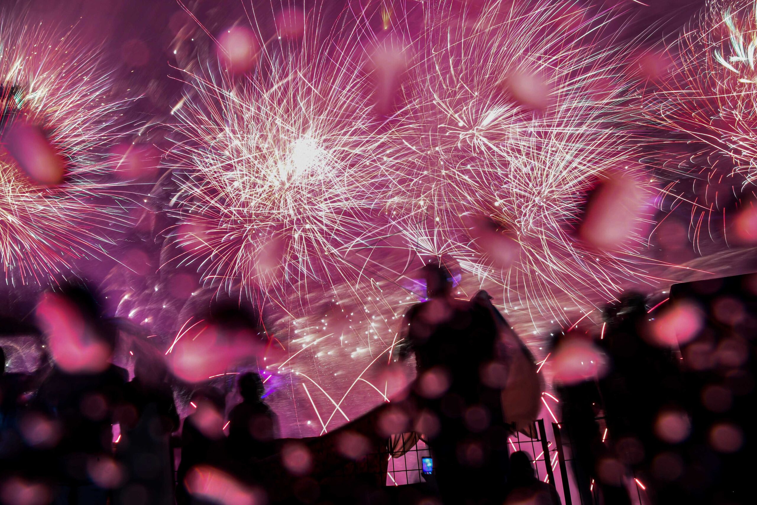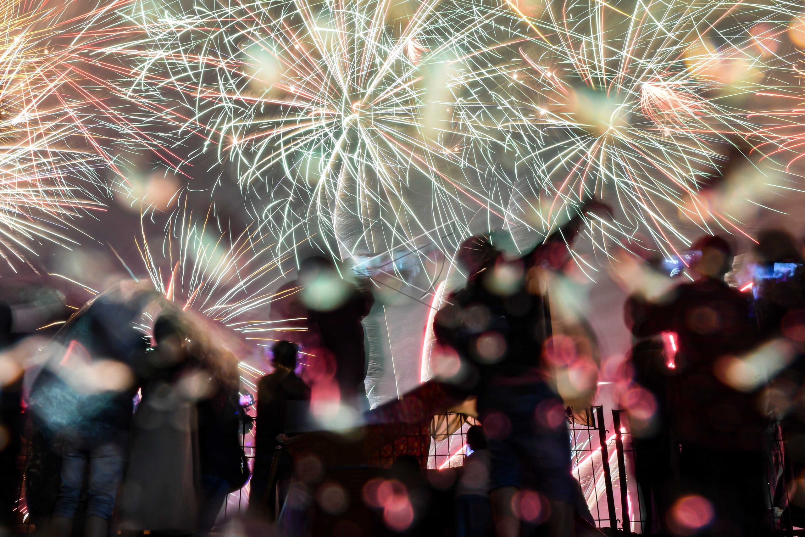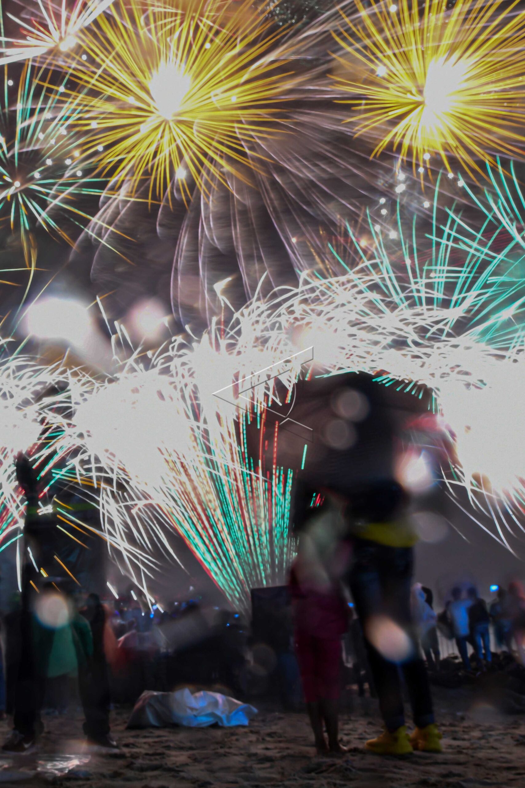 Sejumlah warga masyarakat menikmati pesta kembang api di Pantai Lagoon, Taman Impian Jaya Ancol, Jakarta, Rabu (1/1/2020). Pesta kemang api tersebut untuk menyambut tahun baru 2020. ANTARA FOTO/Muhammad Adimaja/pd.