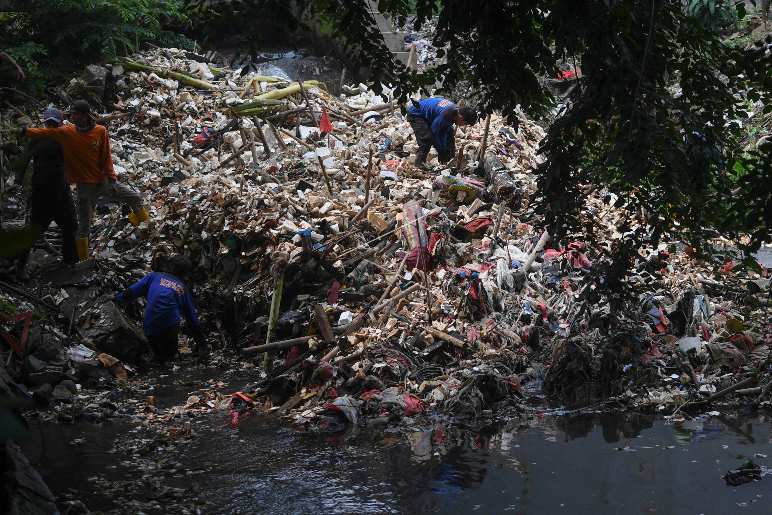 Petugas membersihkan sampah yang didominasi oleh potongan styrofoam yang digunakan untuk kemasan produk di Kali Baru, Kota Depok, Jawa Barat, Selasa (3/3/2020). Kementerian Lingkungan Hidup dan Kehutanan menargetkan para produsen dapat mengurangi sampah dari kemasan produk sebesar 30 persen pada 2029. ANTARA FOTO/Wahyu Putro A/pd