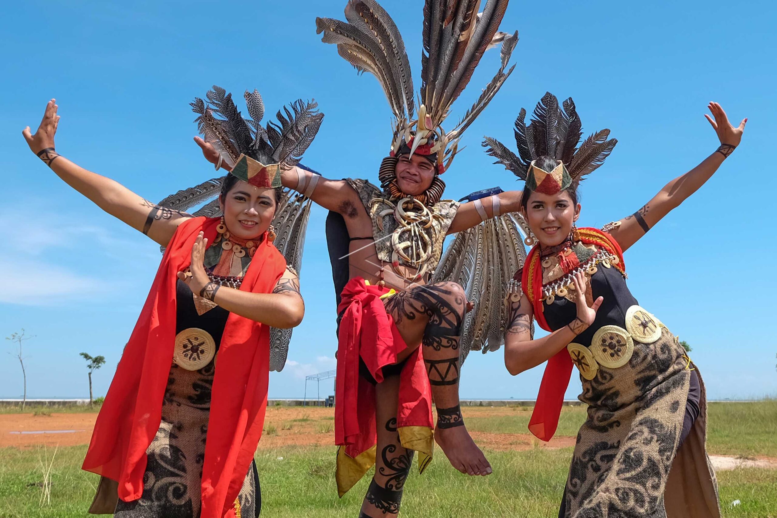 Tiga penari Kalimantan Tengah berpose menjelang menampilkan tarian Kinyah Mandau yang merupakan rangkaian pertunjukan ritual Bekeparat di Pantai Amal Tarakan, Kalimantan Utara, Jumat (27/11/2015). ANTARA FOTO/Fadlansyah/pd/dw/nym.
